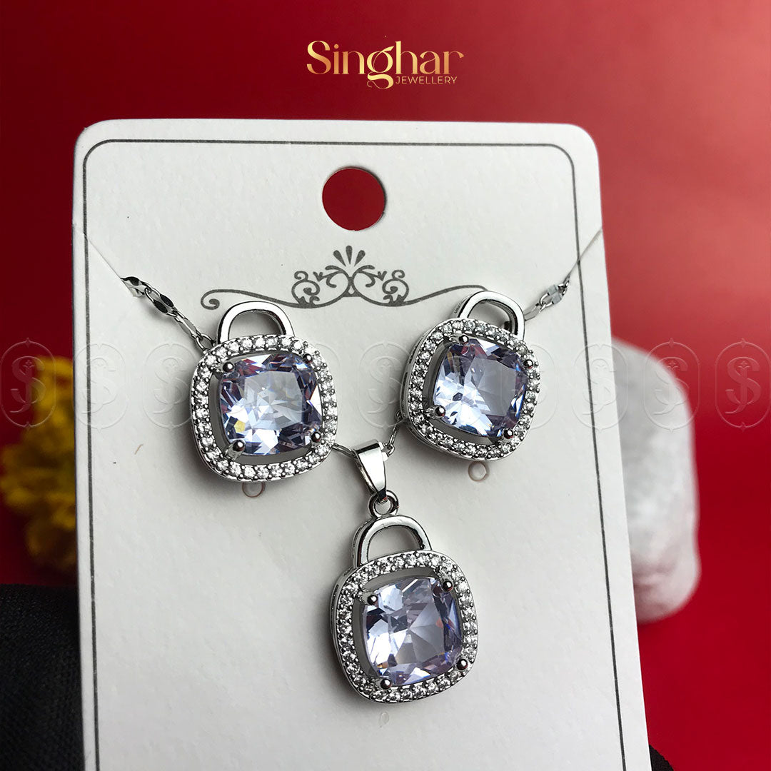 This elegant jewelry set features a necklace and matching earrings with unique lock-shaped pendants. Each pendant showcases a captivating icy blue gemstone surrounded by a sparkling halo, creating a sophisticated and timeless look.