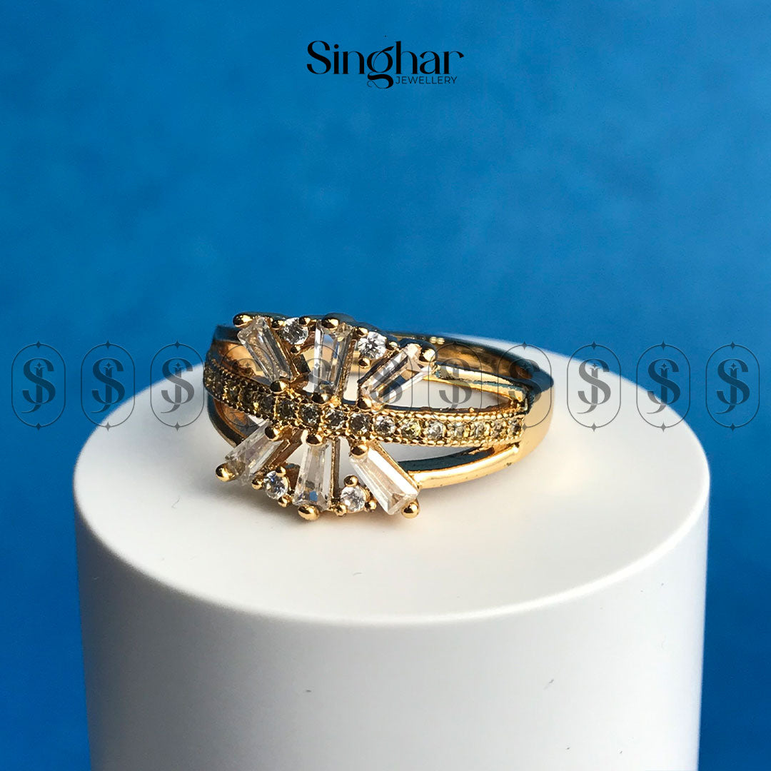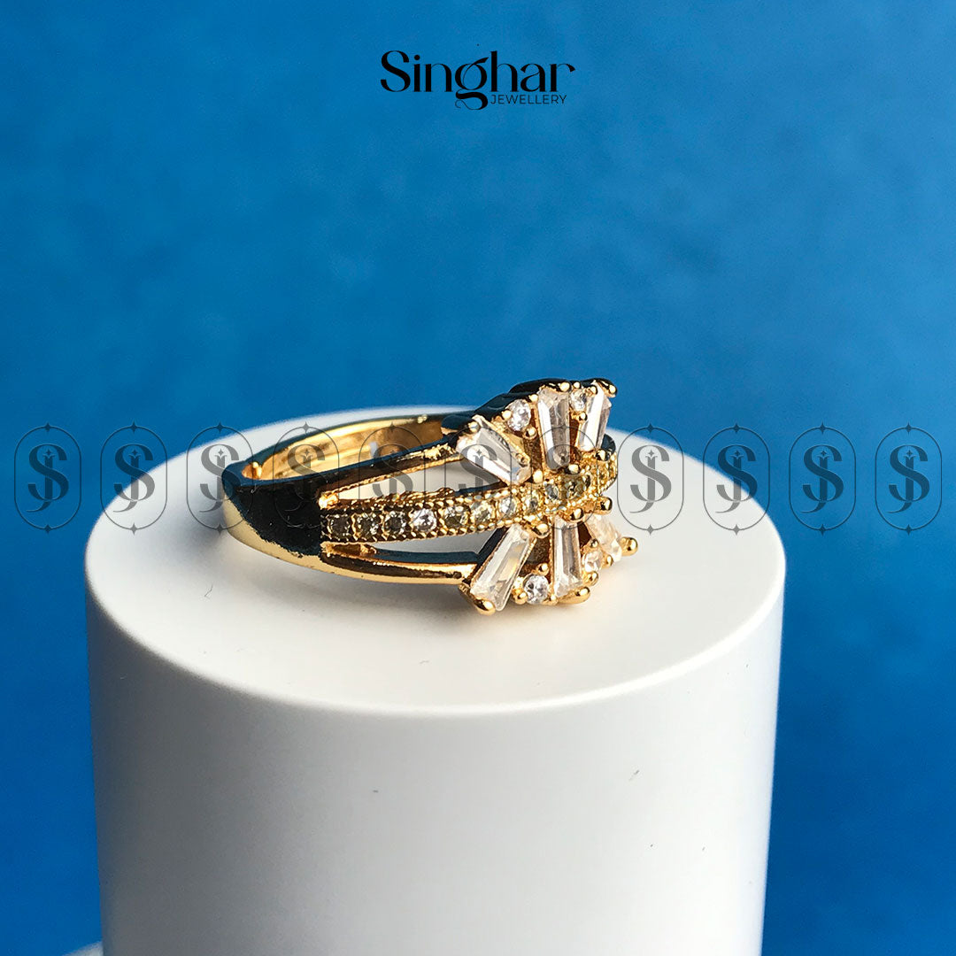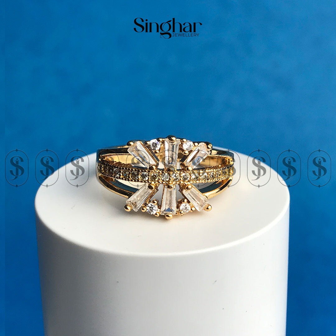 Designed to resemble a royal crown, this ring dazzles with perfectly arranged crystals and intricate gold detailing. A regal accessory for special moments.