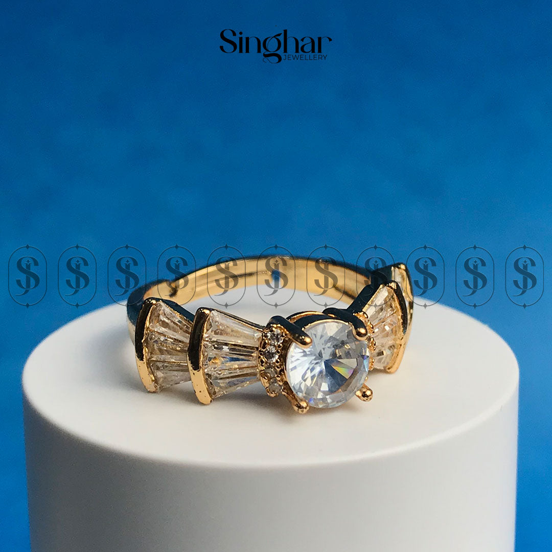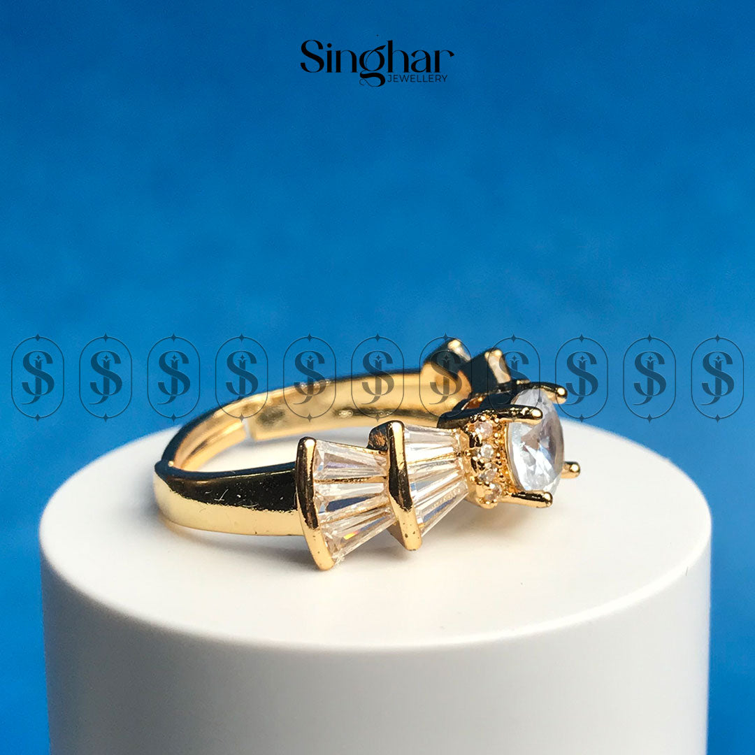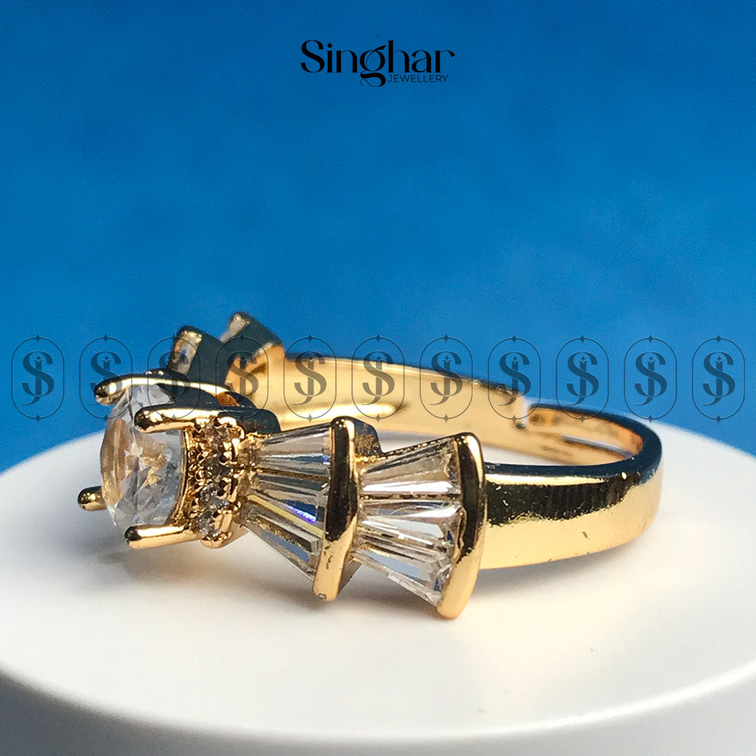 This exquisite ring is a celebration of timeless elegance and modern luxury. Featuring a radiant round-cut crystal centerpiece, it is beautifully flanked by a unique fan arrangement of baguette-cut crystals, all set in a rich golden frame. The intricate detailing and lustrous gold-tone finish create a perfect harmony of brilliance and sophistication. Ideal for special occasions or as a statement accessory, this ring adds a regal touch to any look, making you shine with every movement.