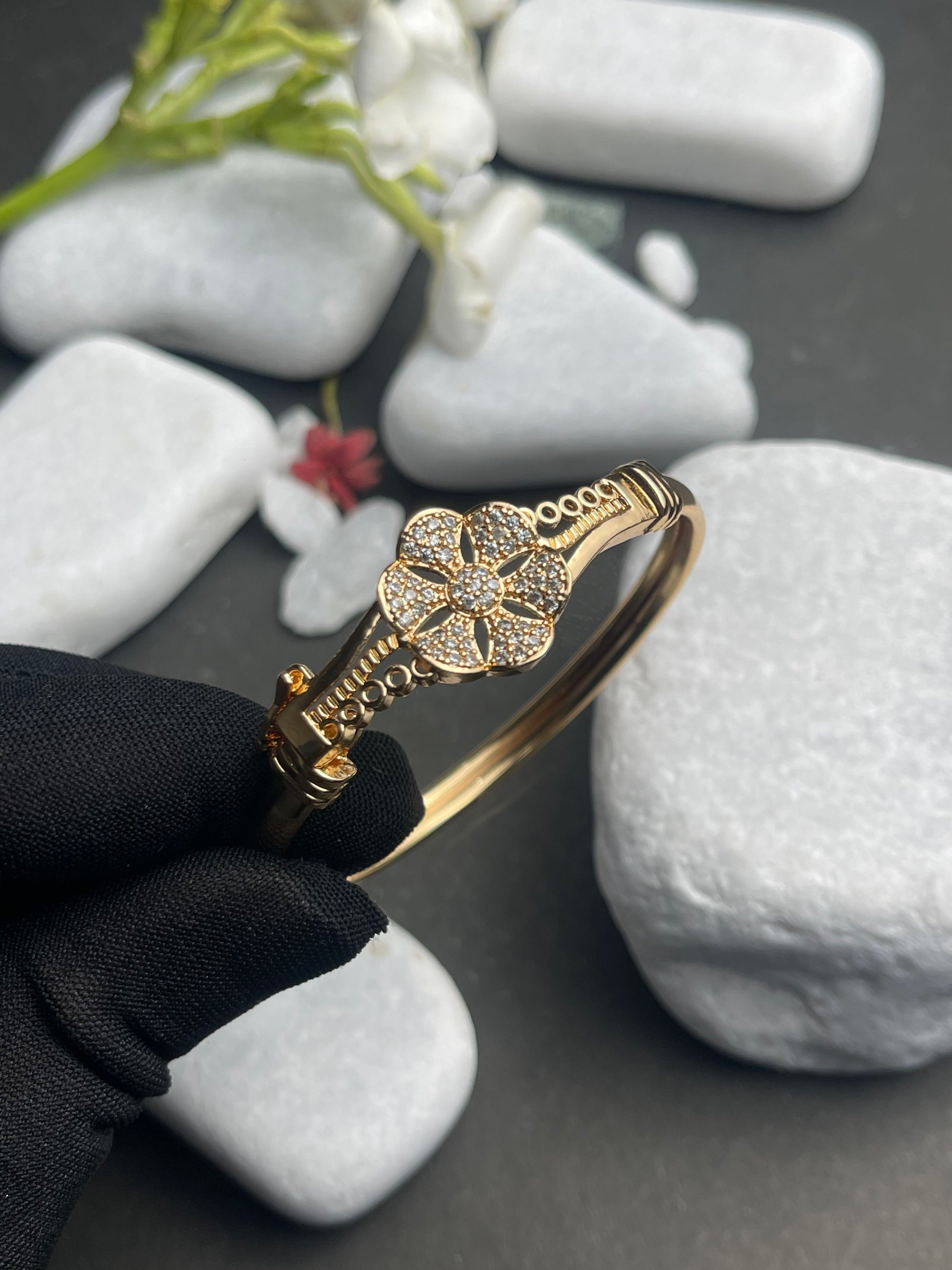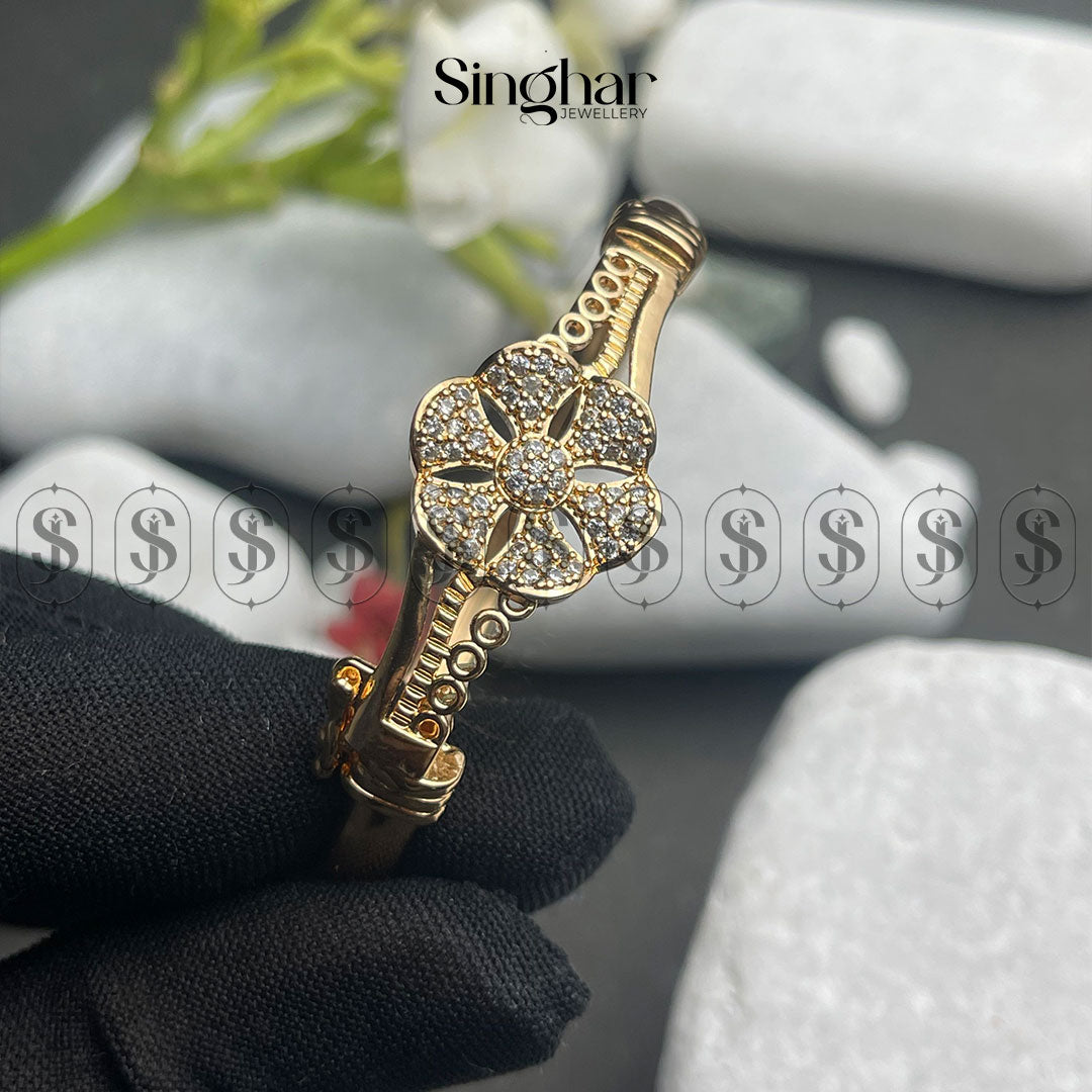 Radiate elegance and charm with the Shimmering Daisy Bracelet, a stunning piece that captures the timeless beauty of nature. This gold-plated bracelet features a delicate daisy design, enhanced by sparkling gemstones that shimmer with every movement. The intricate petals catch the light, adding a graceful touch of sophistication to your ensemble.