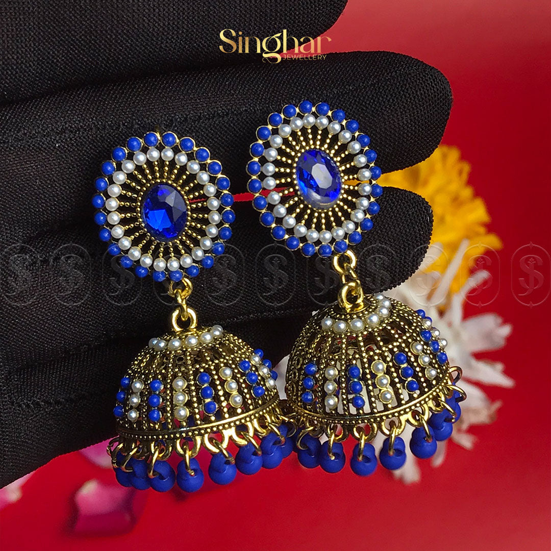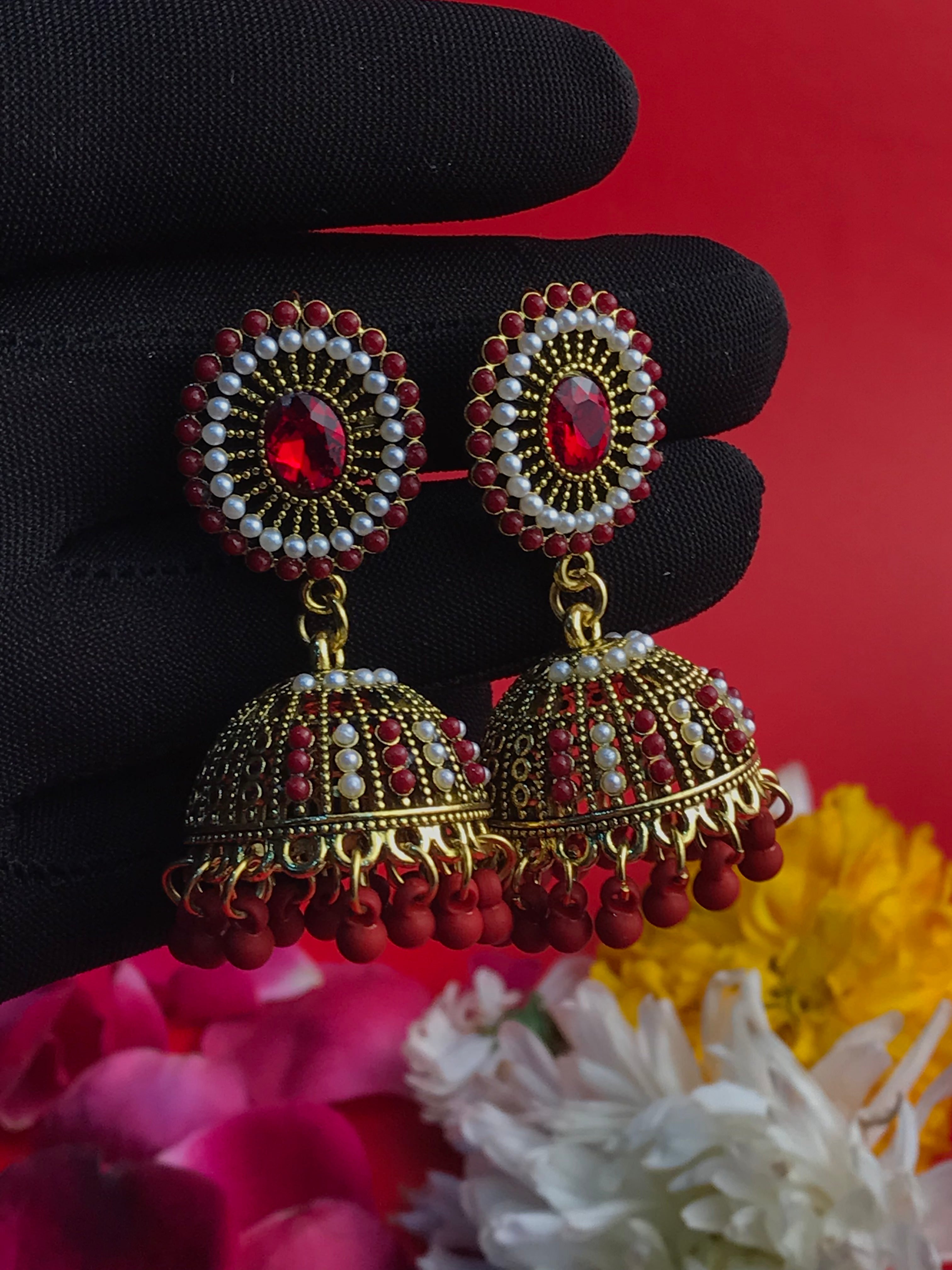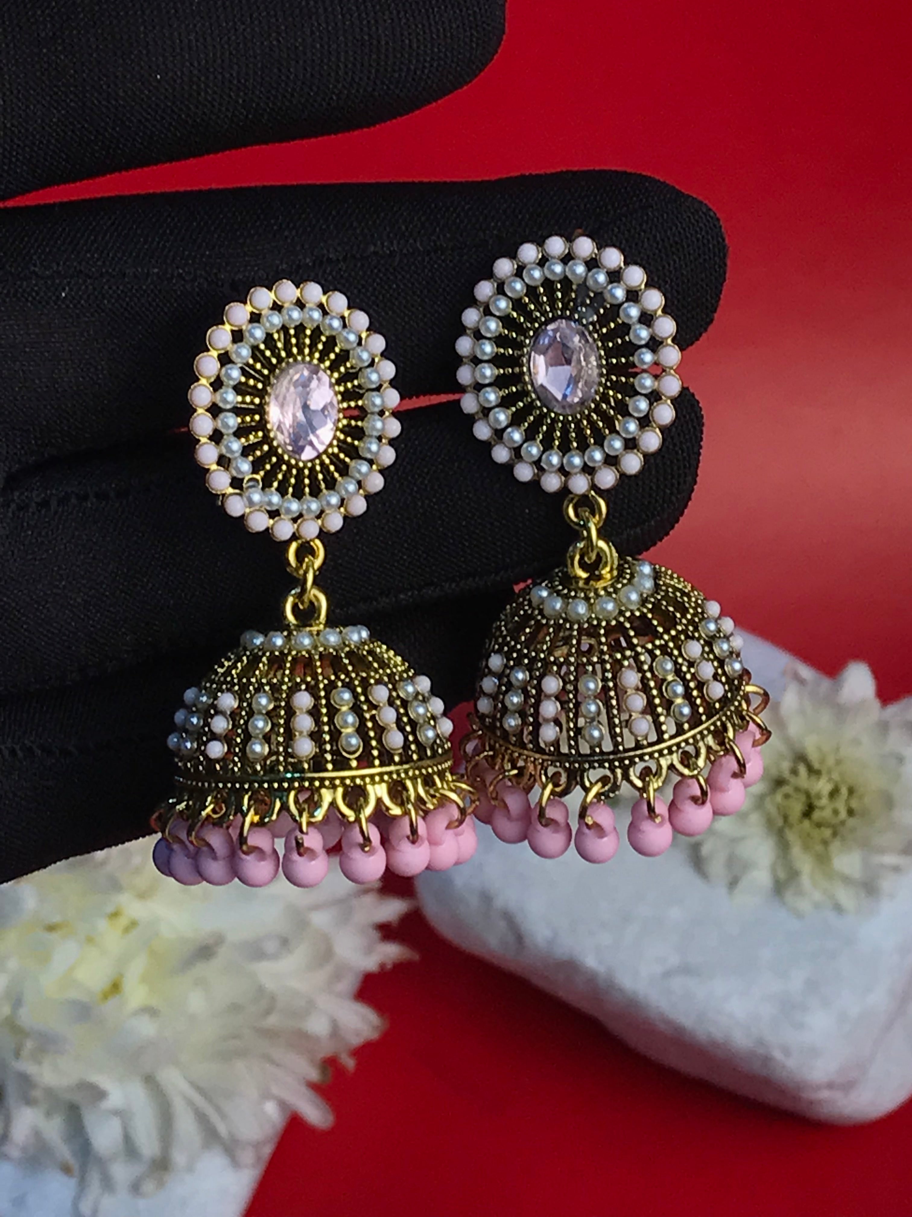 Step into a world of timeless elegance with the Blush Royale Jhumkas. These enchanting earrings feature delicately handcrafted dome-shaped designs adorned with shimmering pearls, soft pink accents, and a centerpiece of radiant crystal. The intricate filigree work highlights the golden tones, while the dainty pink bead tassels add a playful yet regal touch.