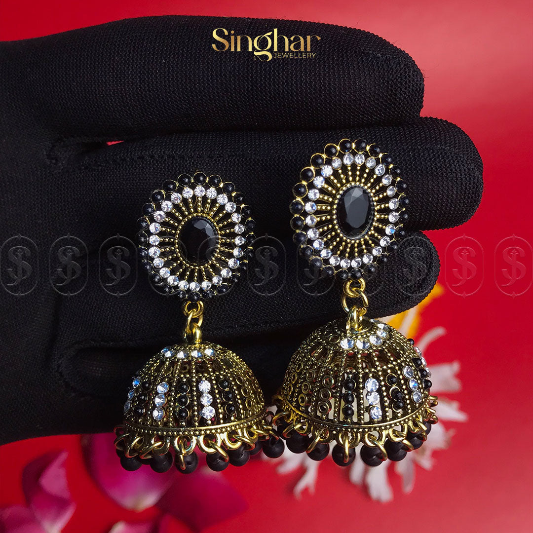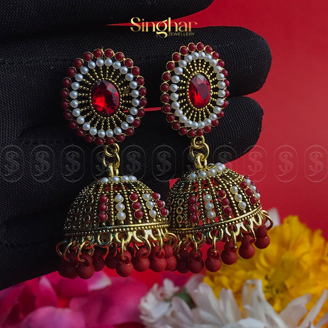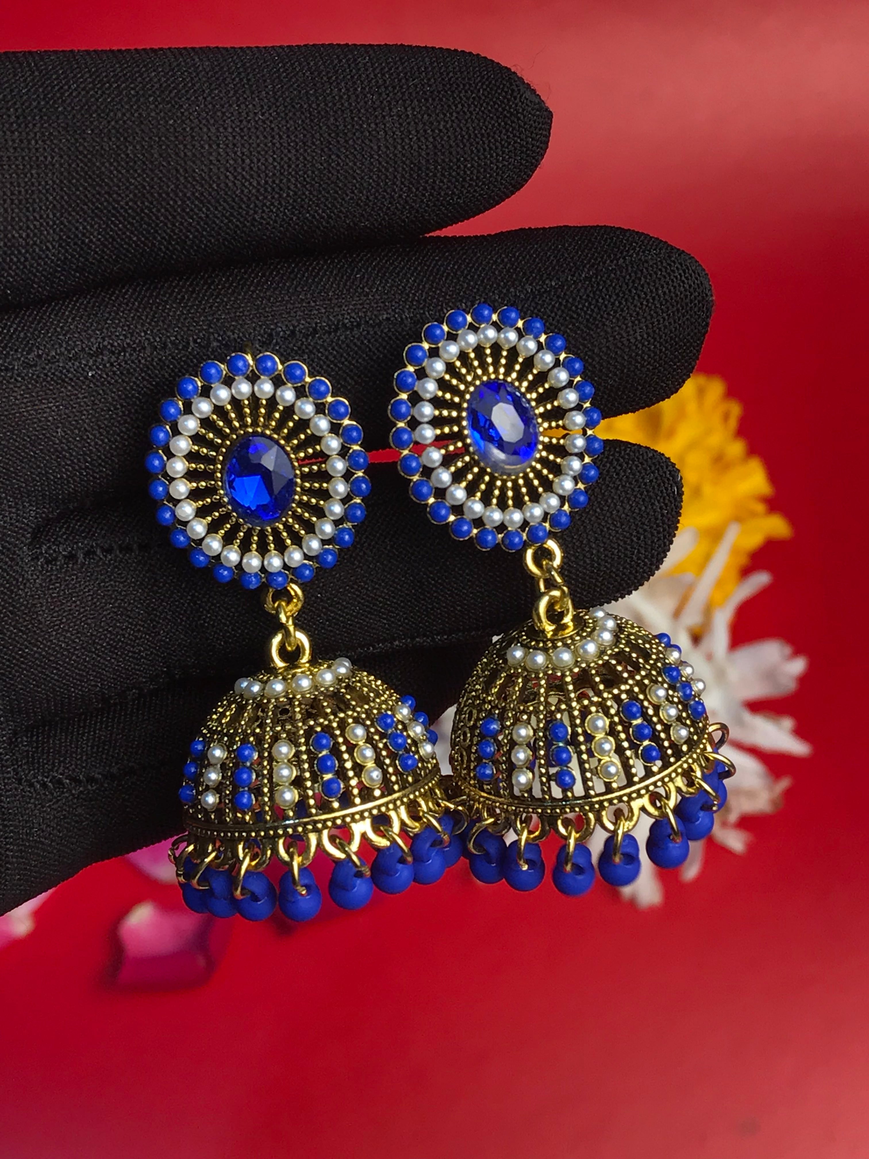 Step into a world of timeless elegance with the Blush Royale Jhumkas. These enchanting earrings feature delicately handcrafted dome-shaped designs adorned with shimmering pearls, soft pink accents, and a centerpiece of radiant crystal. The intricate filigree work highlights the golden tones, while the dainty pink bead tassels add a playful yet regal touch.