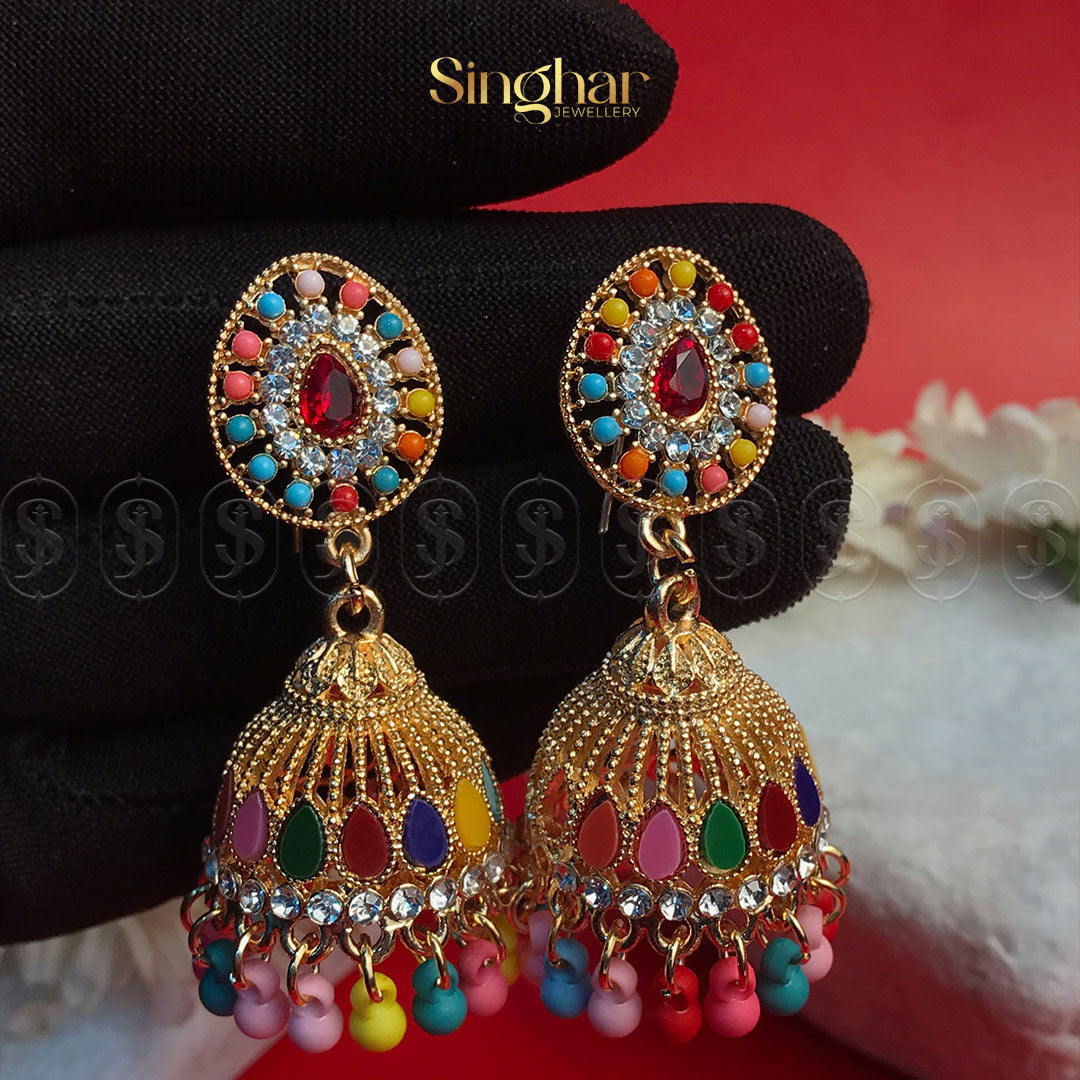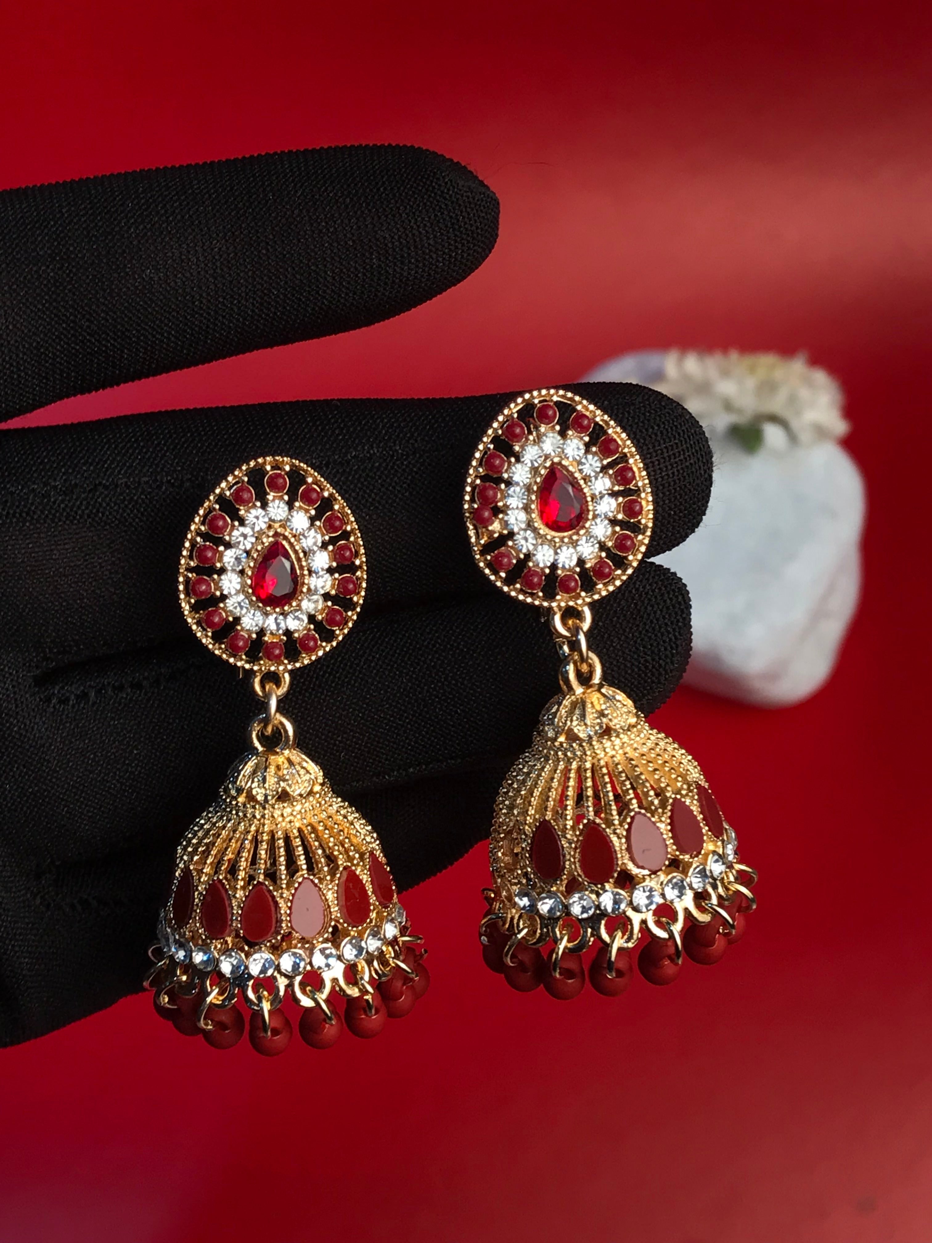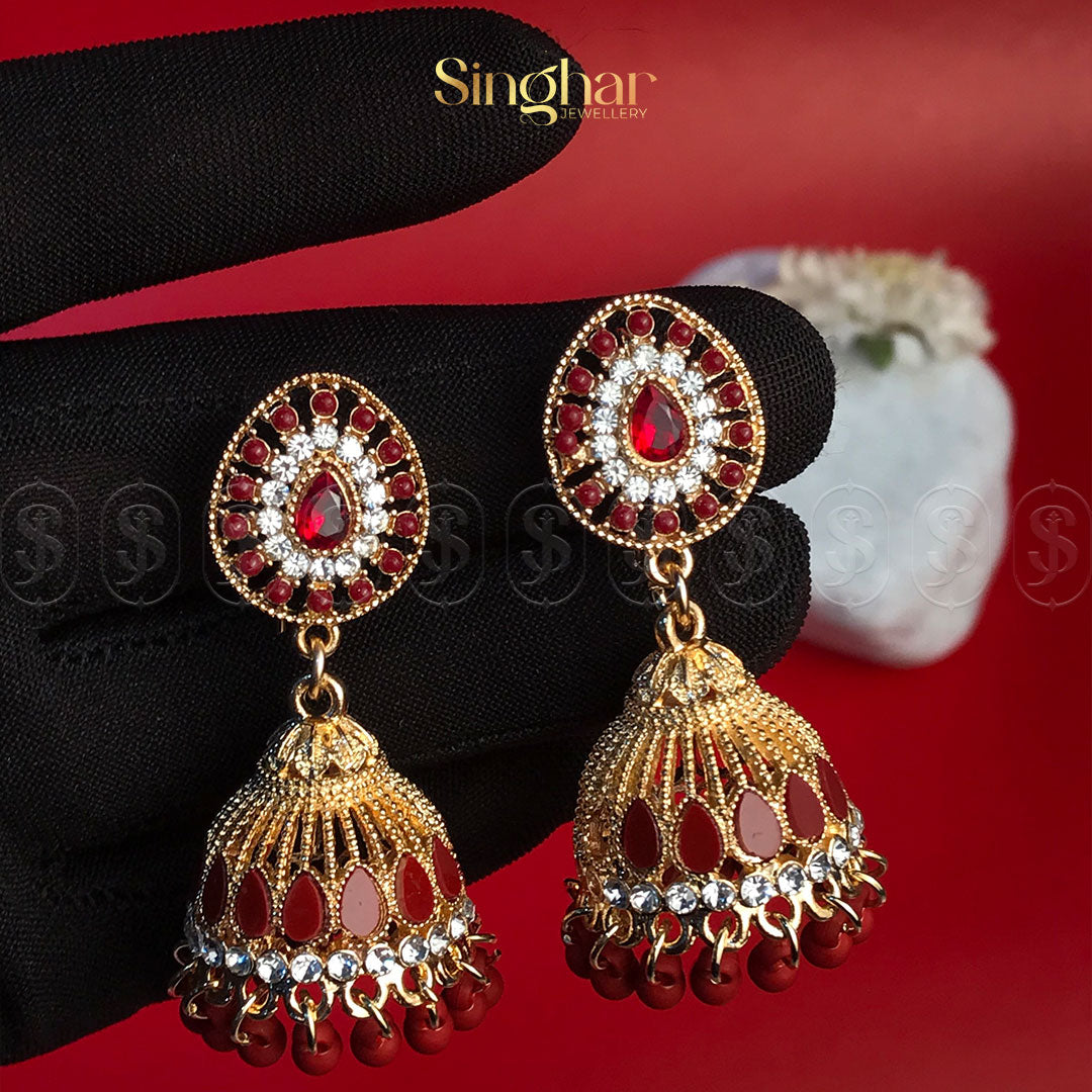 Embrace the charm of tradition with the Bellara Jhumkas, a pair of timeless earrings that celebrate the iconic bell-shaped design of classic Indian jewelry. Crafted with intricate detailing and a graceful structure, these jhumkas feature a delicate, swaying bell form that adds a graceful movement to your look. Their rich design is perfect for those seeking a blend of elegance and cultural heritage.