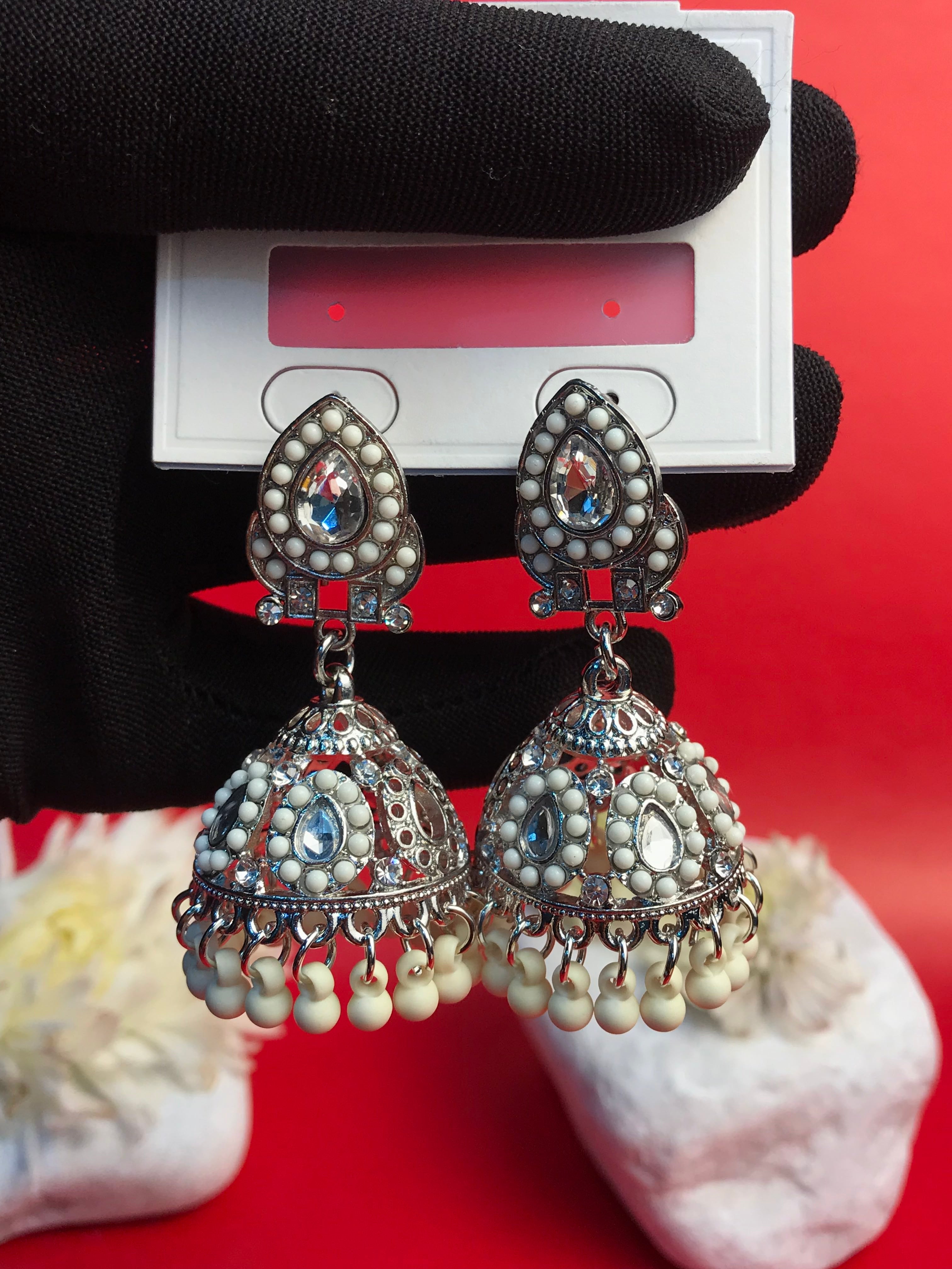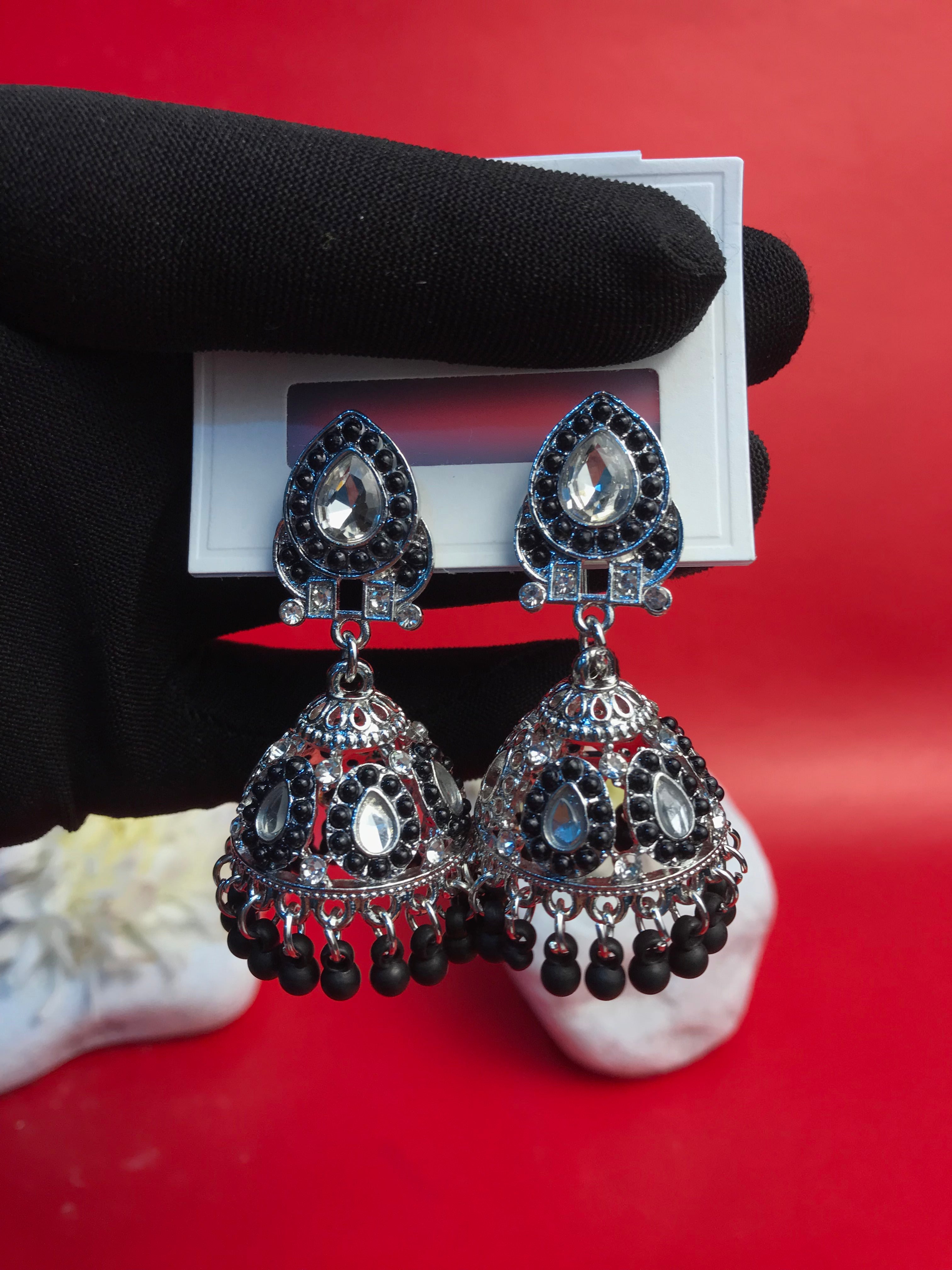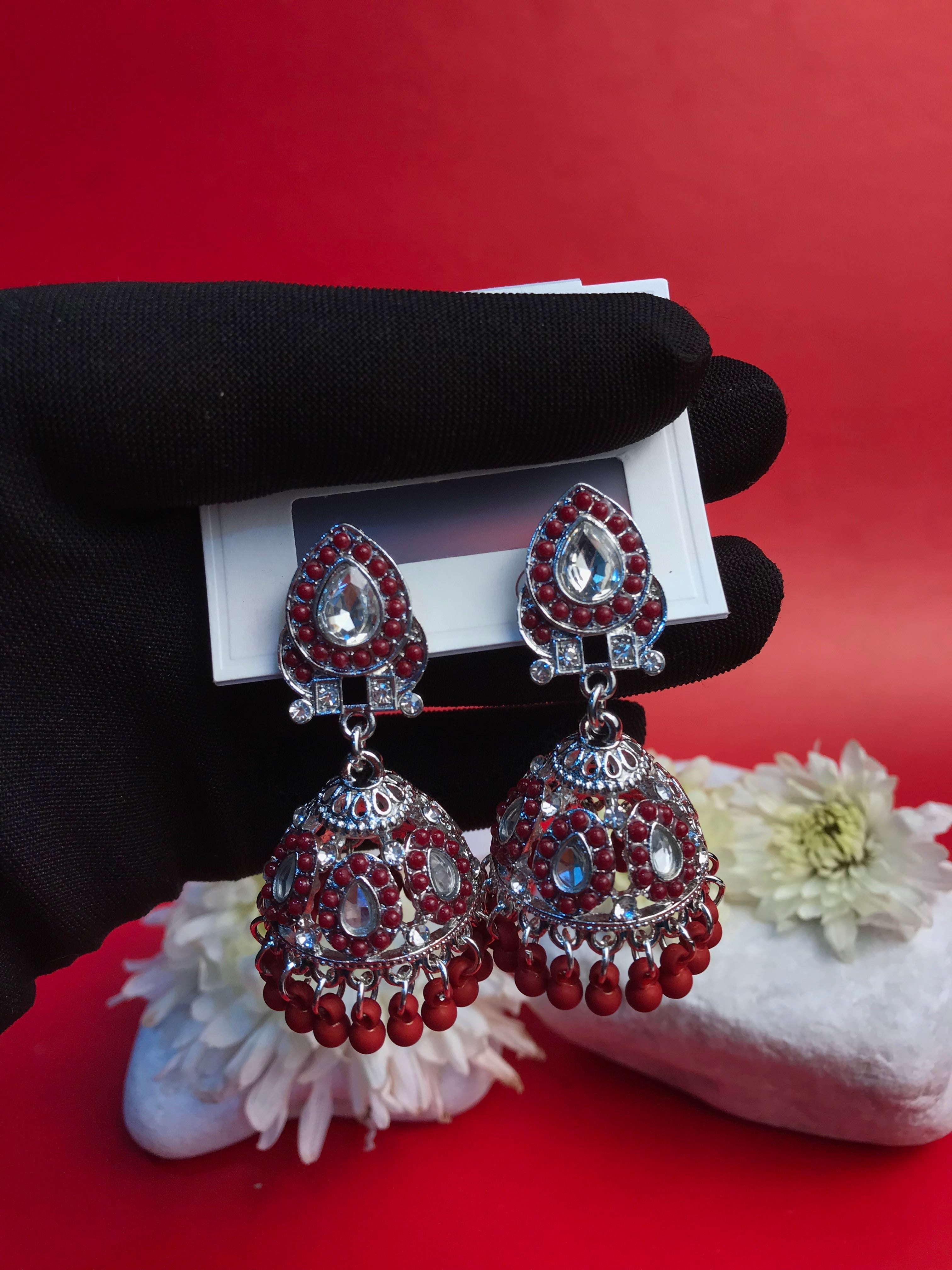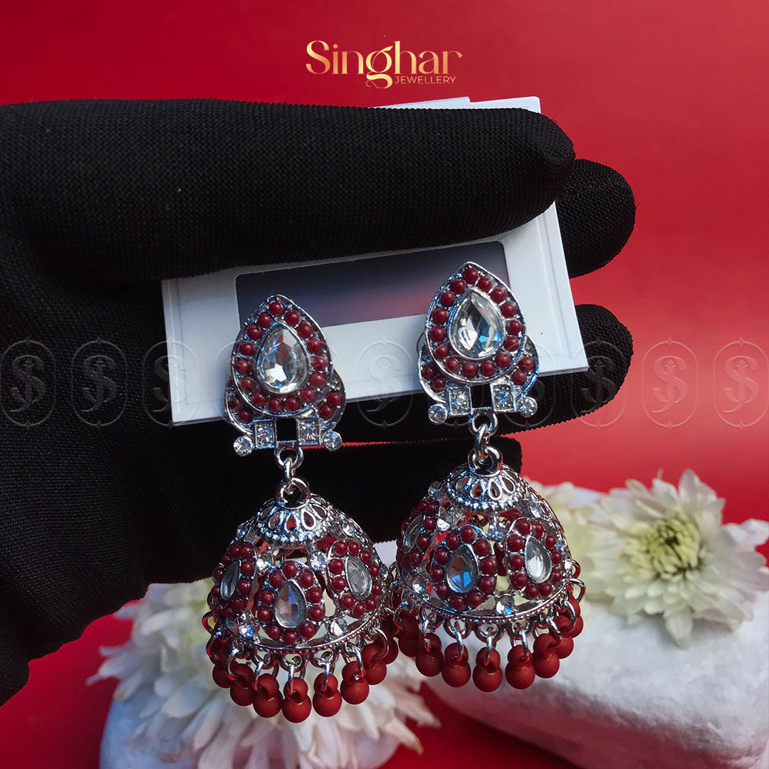Make a regal statement with the Scarlet Majesty Jhumka, a captivating blend of intricate craftsmanship and bold elegance. Designed with exquisite silver-toned filigree and adorned with rich crimson beads and sparkling stones, these jhumkas evoke an air of timeless royalty. The finely detailed dome-shaped drops, accented with dangling red beads, create a graceful movement and a striking shimmer, perfect for special occasions.