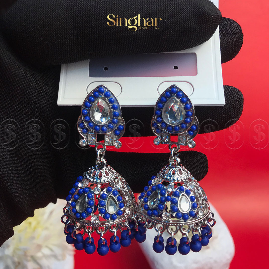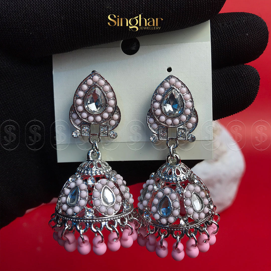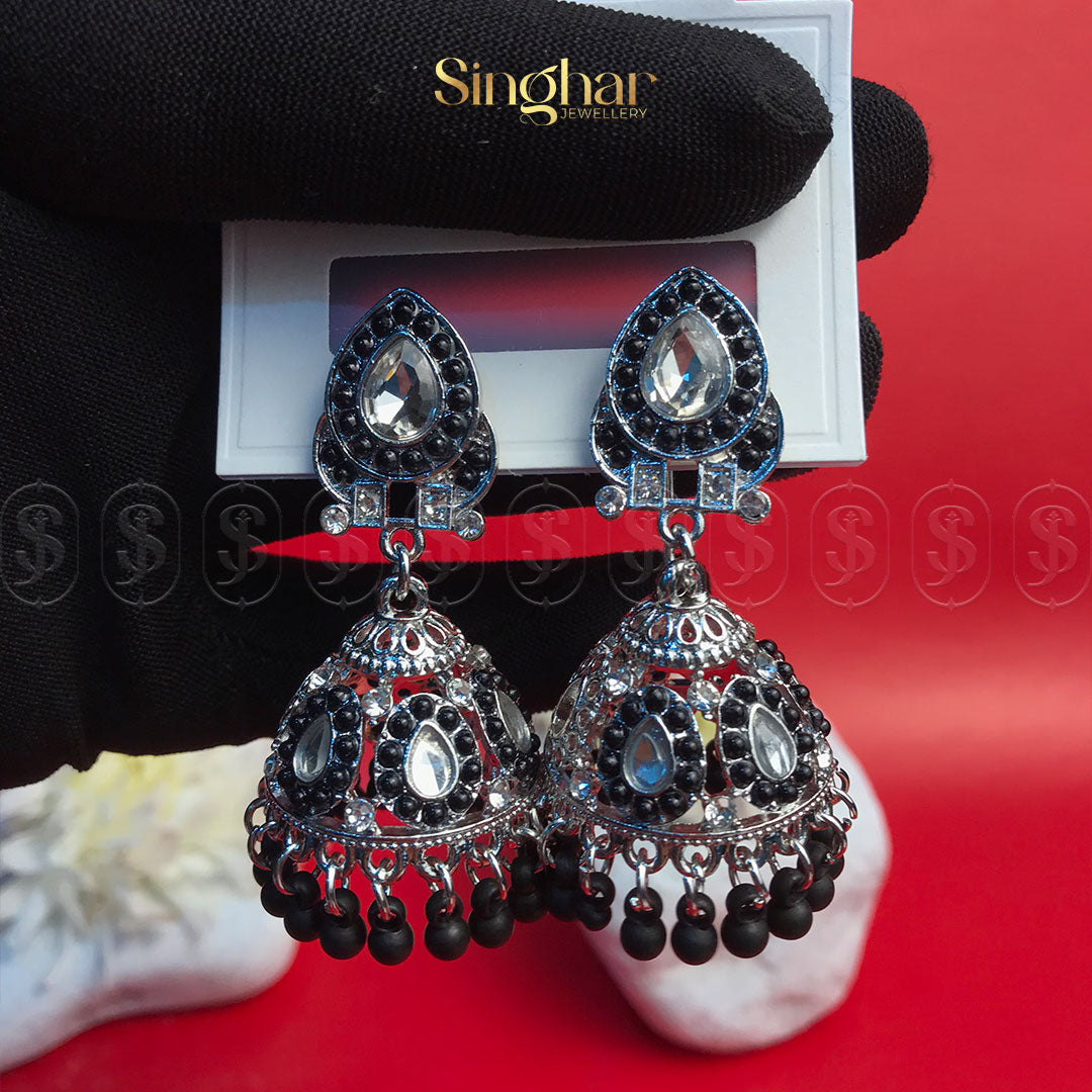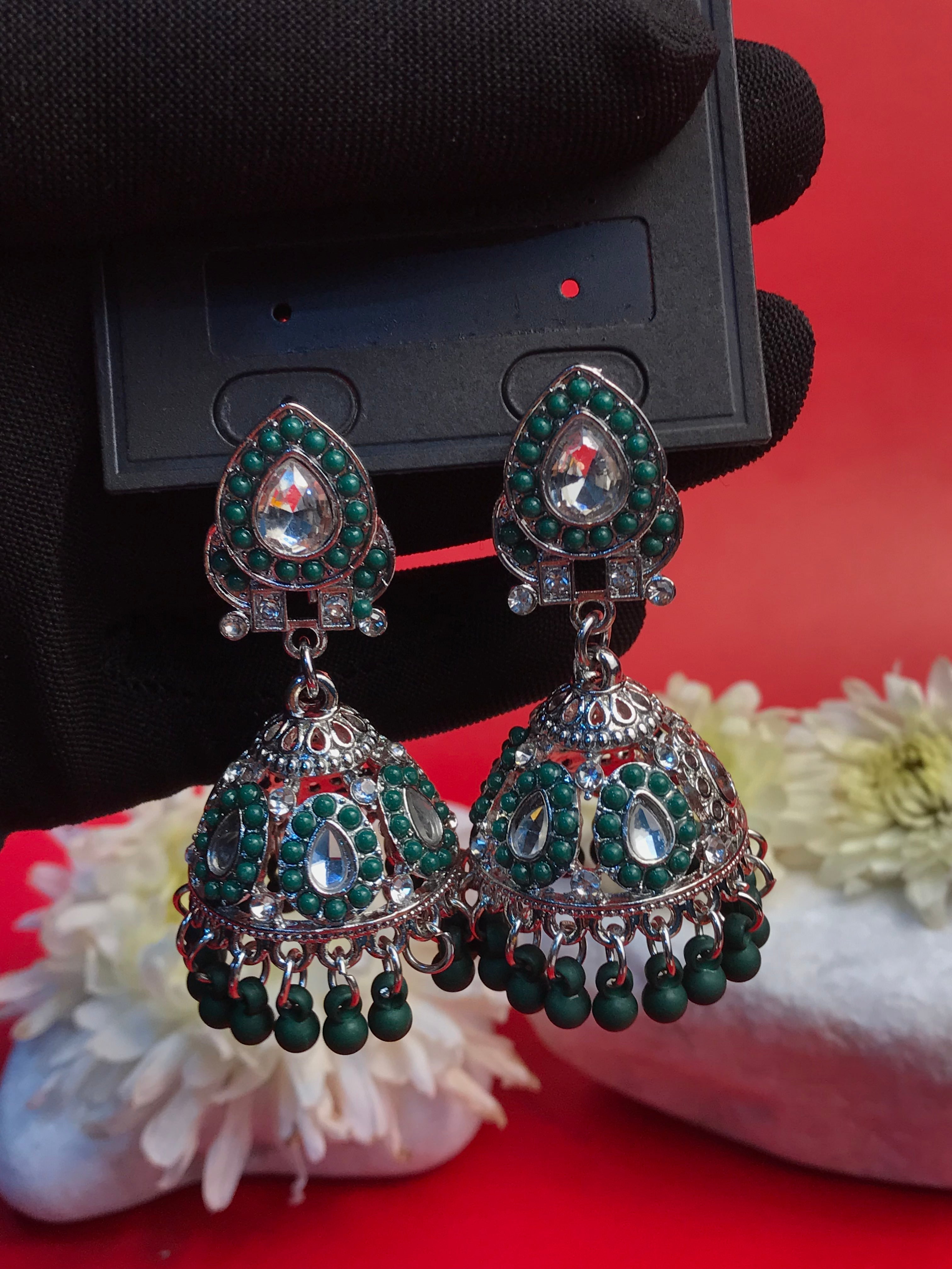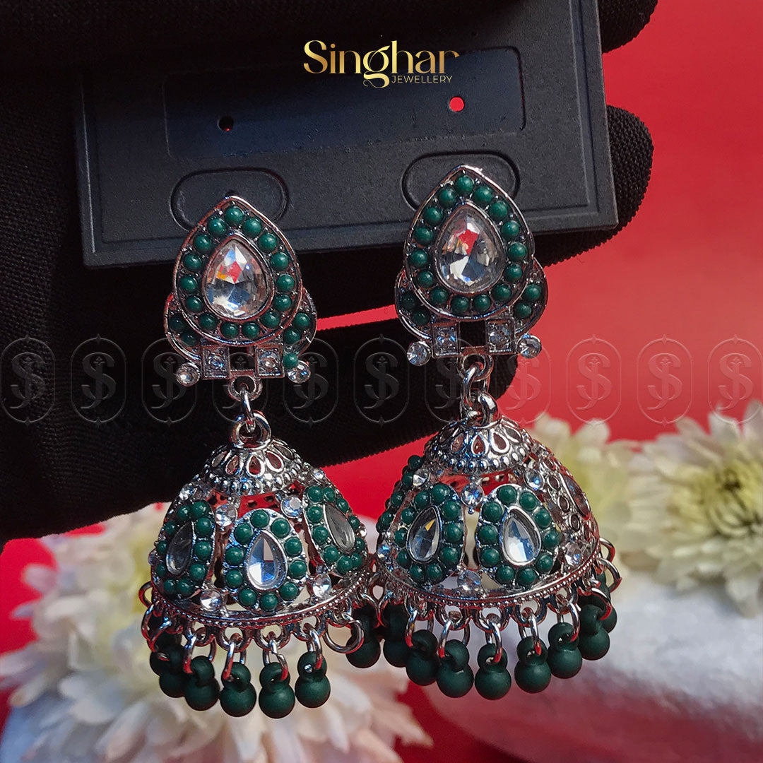 Make a regal statement with the Scarlet Majesty Jhumka, a captivating blend of intricate craftsmanship and bold elegance. Designed with exquisite silver-toned filigree and adorned with rich crimson beads and sparkling stones, these jhumkas evoke an air of timeless royalty. The finely detailed dome-shaped drops, accented with dangling red beads, create a graceful movement and a striking shimmer, perfect for special occasions.