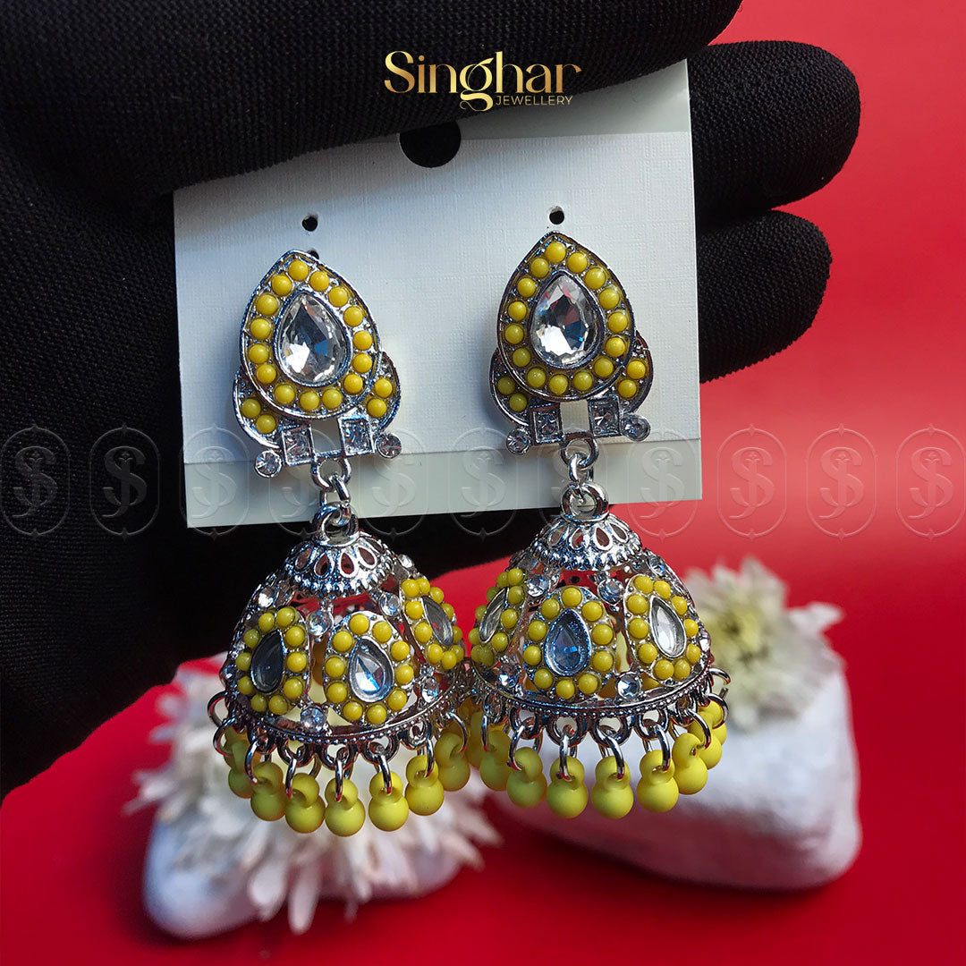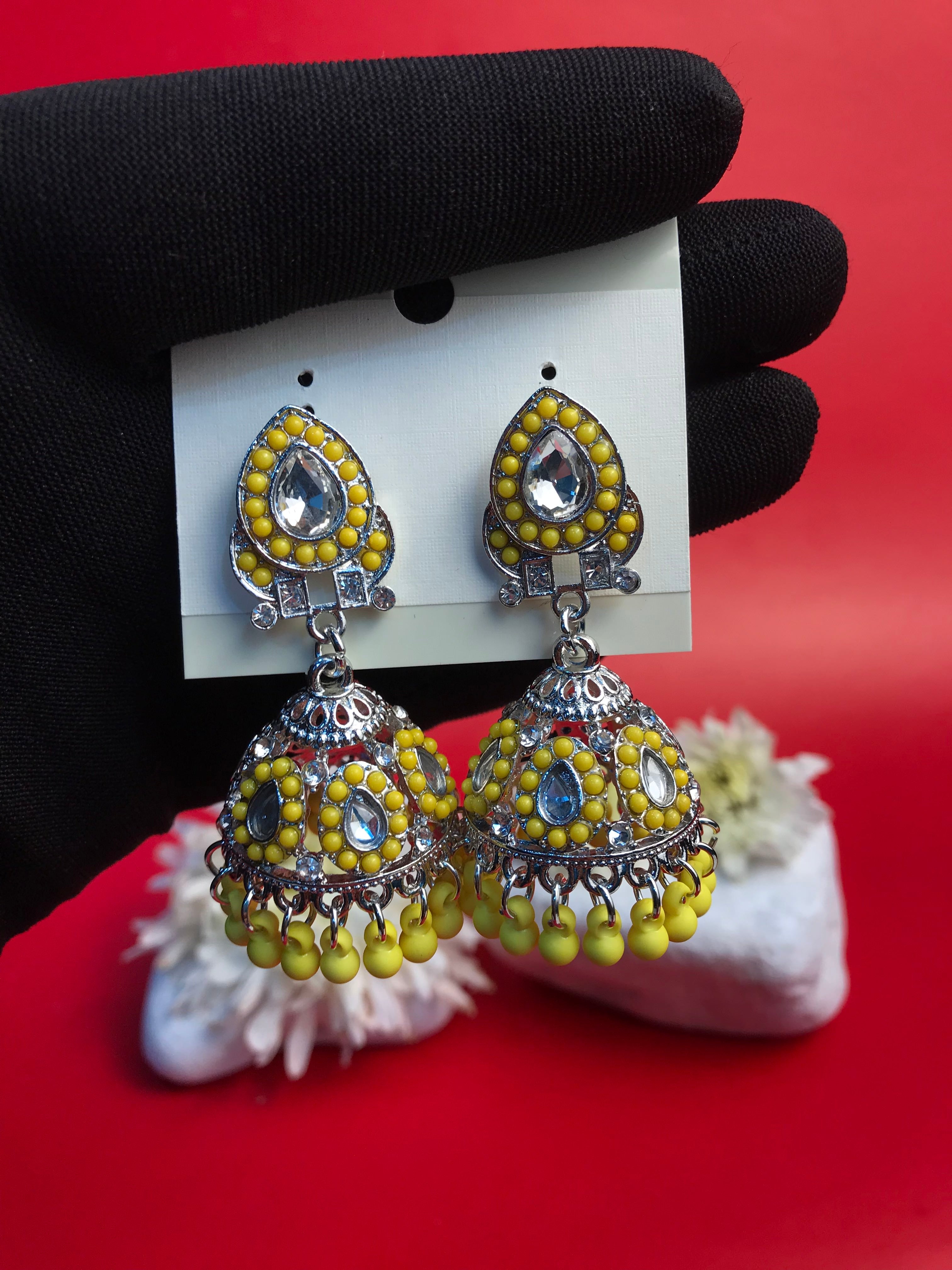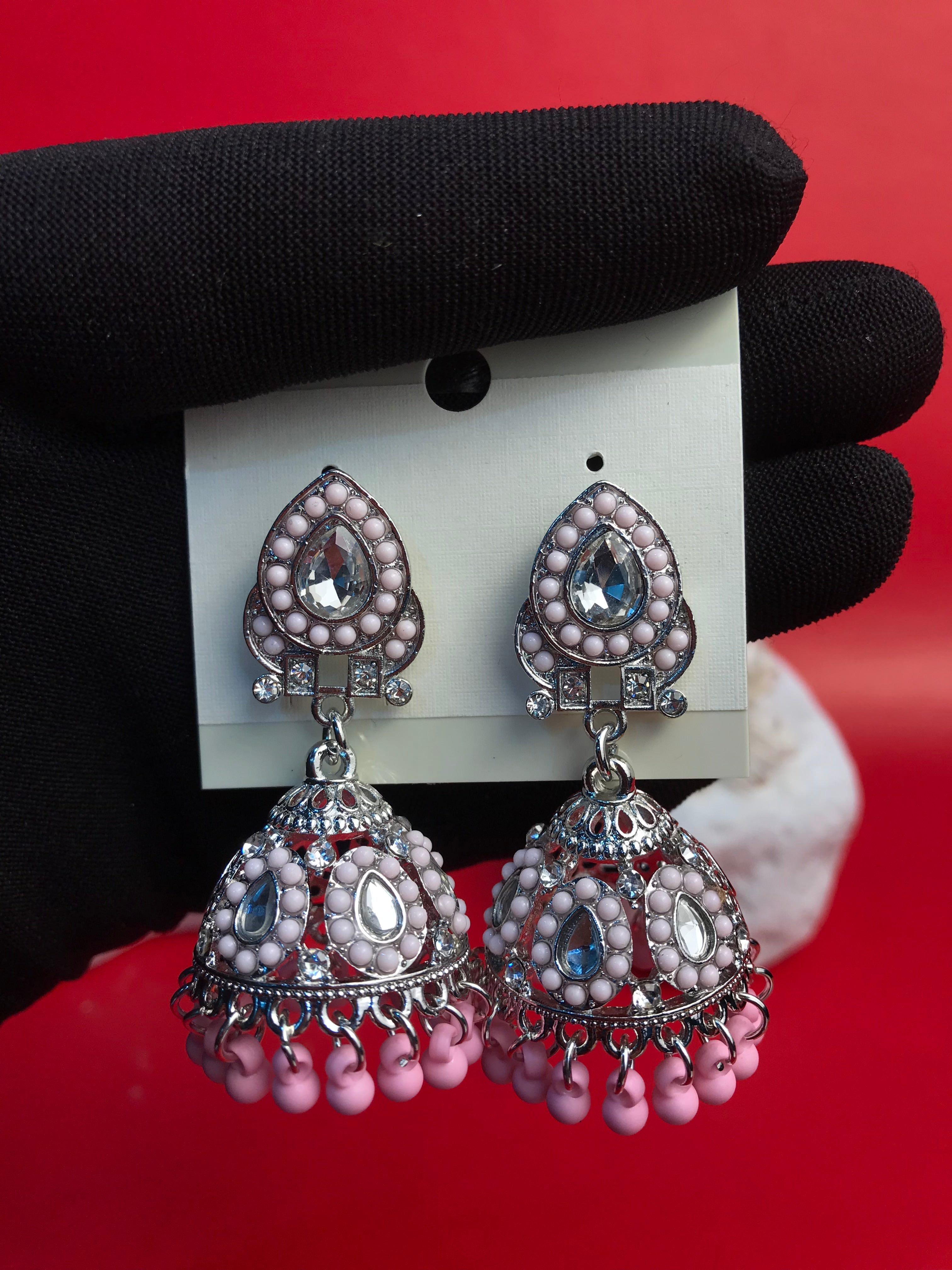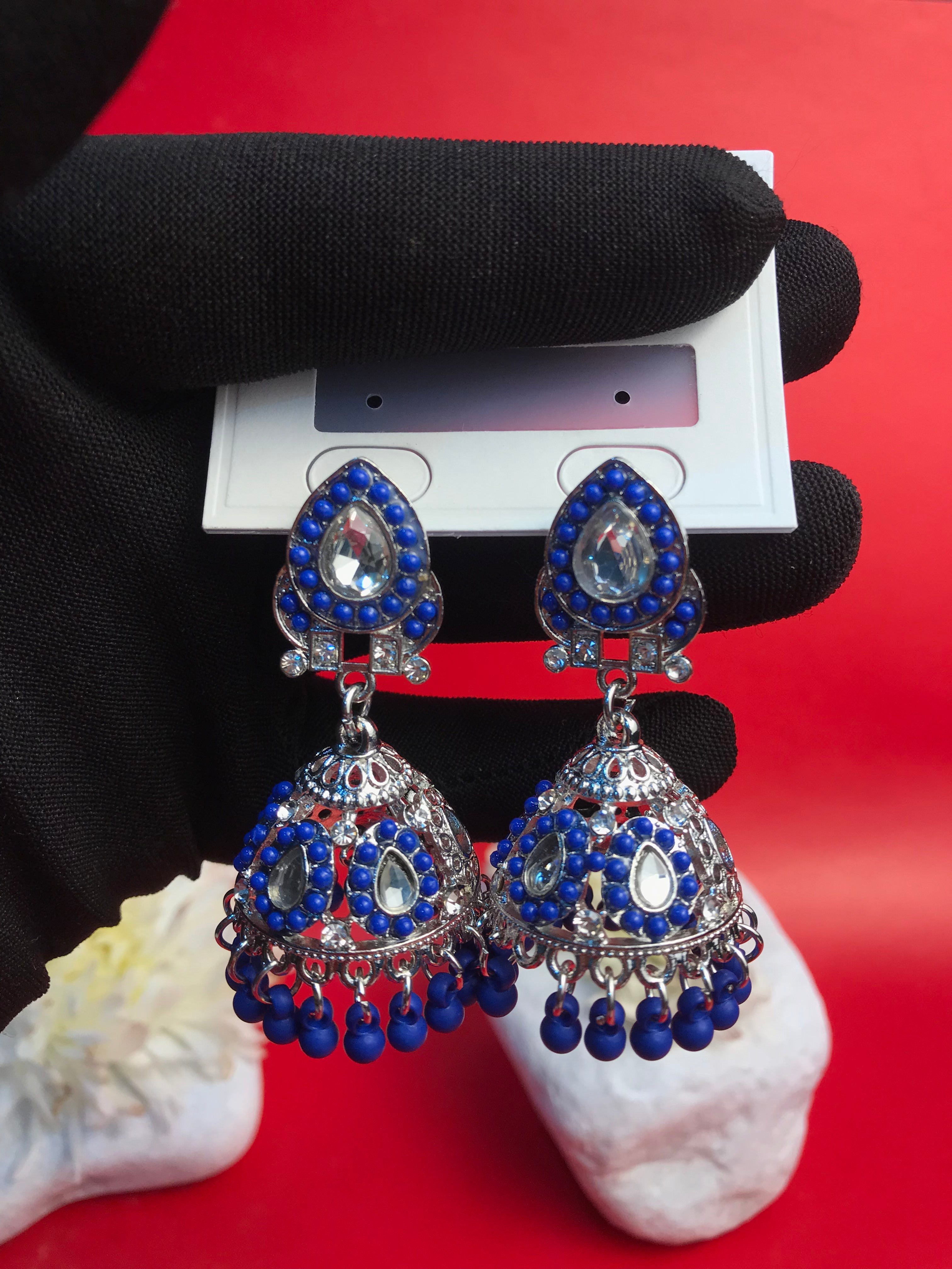 Make a regal statement with the Scarlet Majesty Jhumka, a captivating blend of intricate craftsmanship and bold elegance. Designed with exquisite silver-toned filigree and adorned with rich crimson beads and sparkling stones, these jhumkas evoke an air of timeless royalty. The finely detailed dome-shaped drops, accented with dangling red beads, create a graceful movement and a striking shimmer, perfect for special occasions.