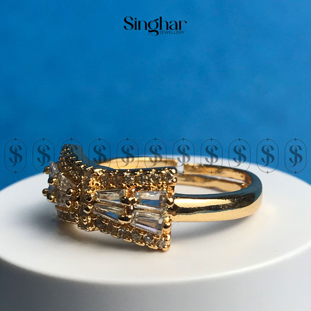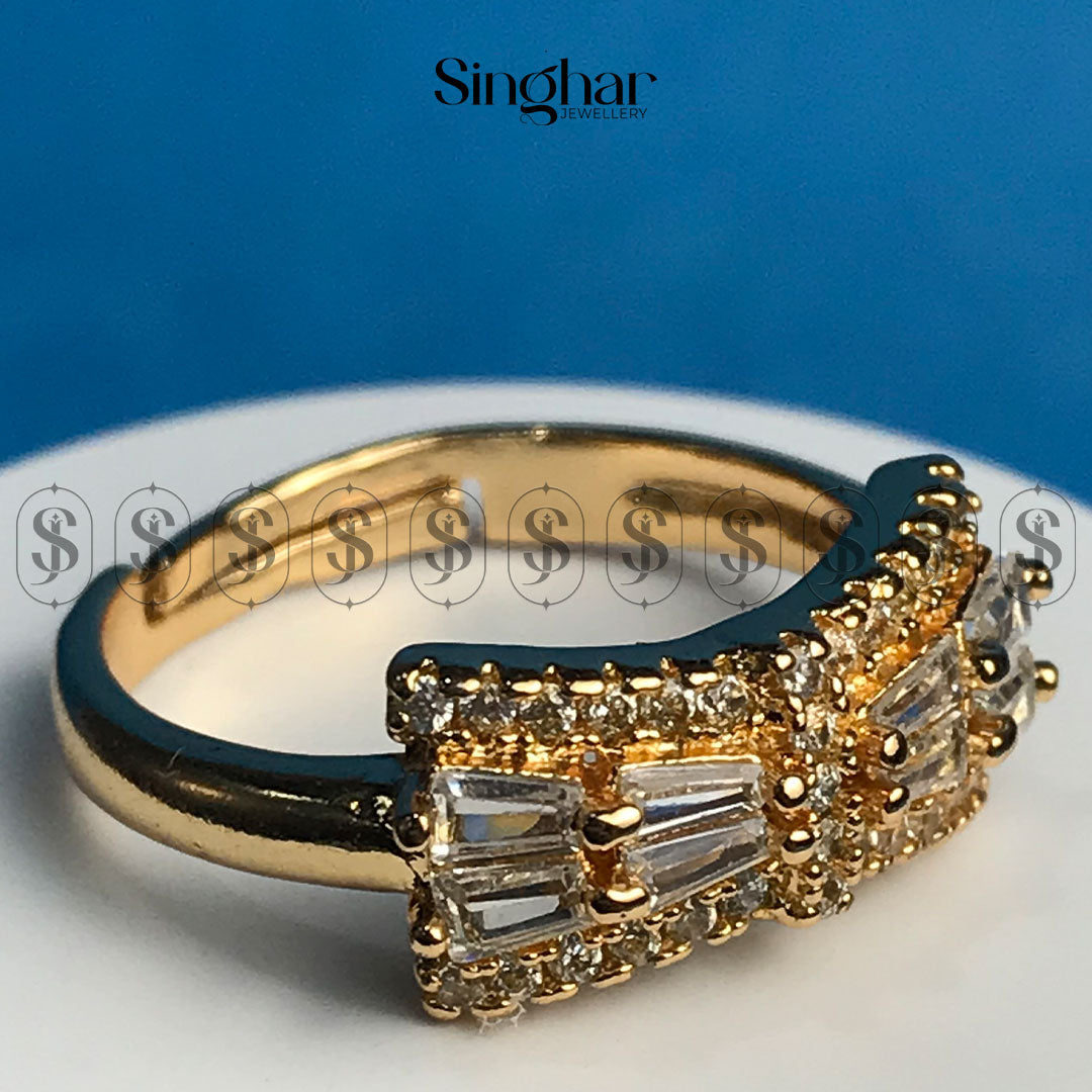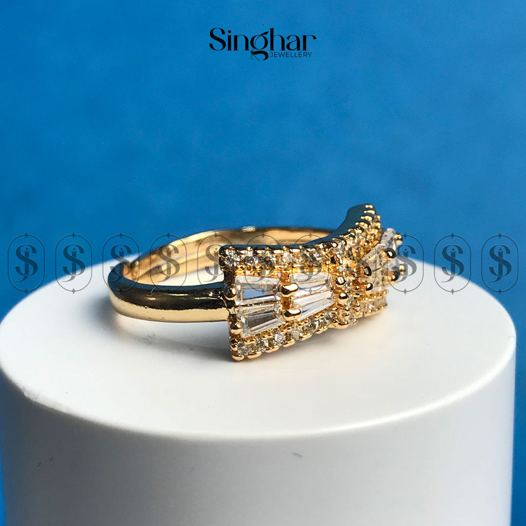 This ring features a sleek bar of baguette-cut stones accented by pave-set smaller stones. The design is modern and elegant, offering understated glamour.