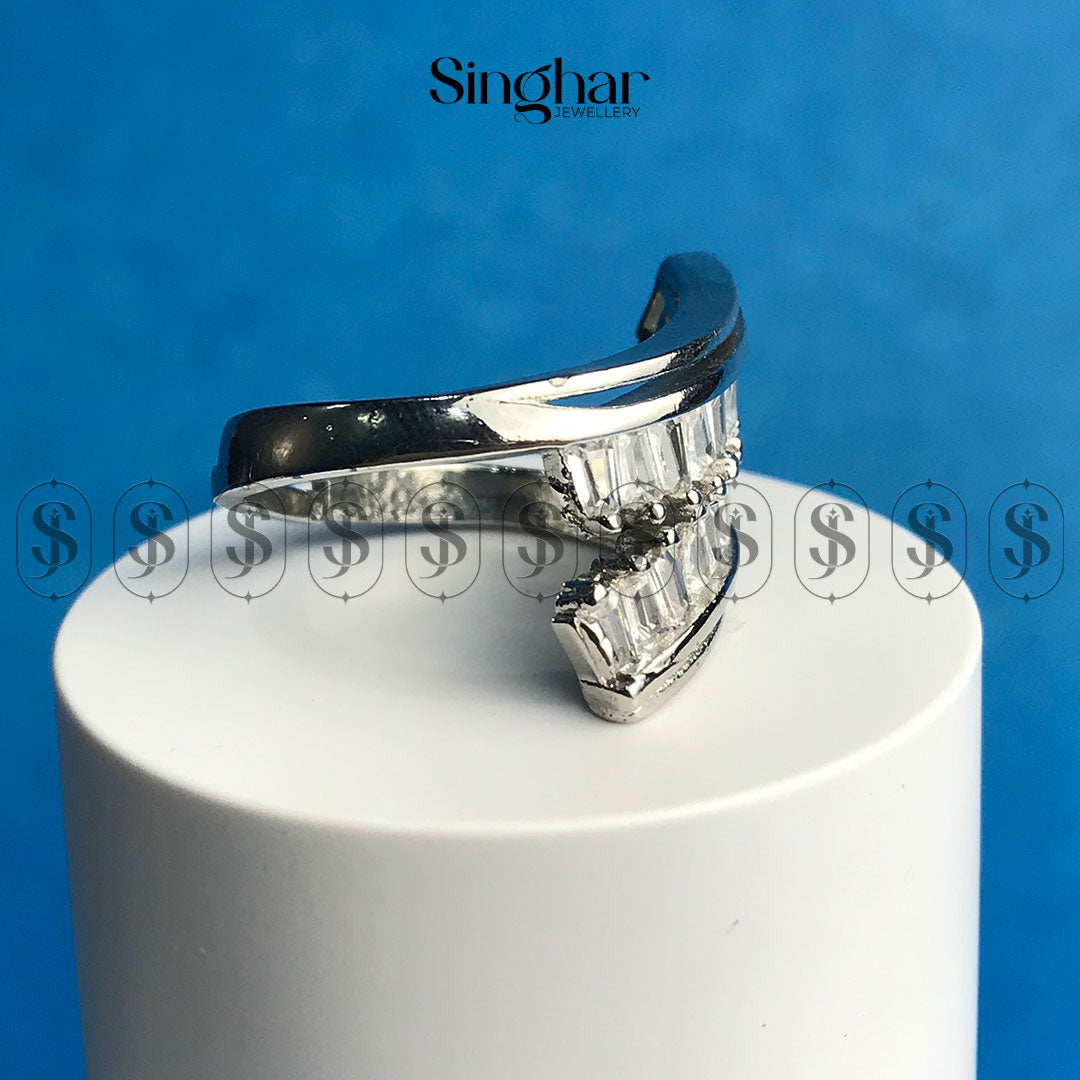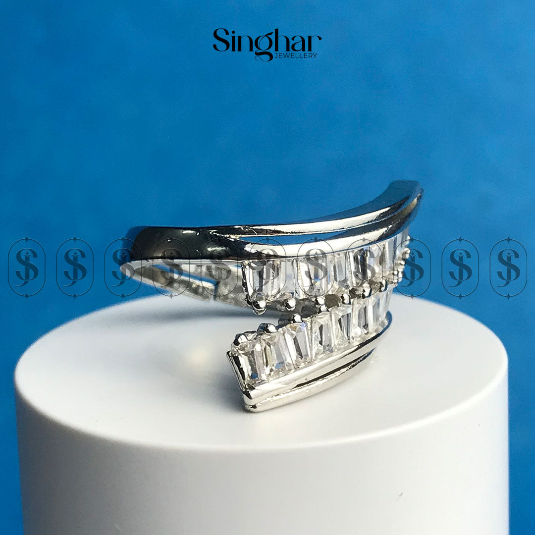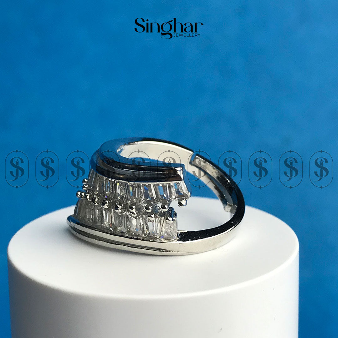 A striking statement piece, this modern ring features a unique open design with a cascading row of sparkling cubic zirconia stones. Its sleek silver finish and asymmetrical shape create a contemporary and eye-catching look.