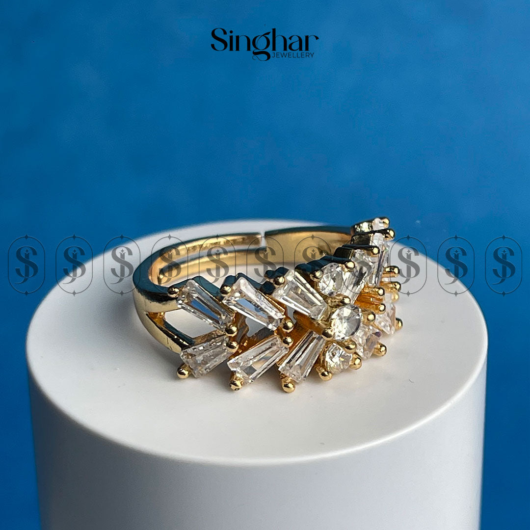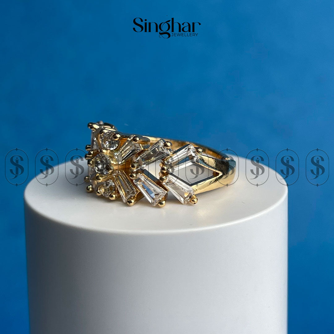 This striking ring features a captivating design inspired by a radiant sunburst. A dazzling array of baguette-cut cubic zirconia stones radiates outwards from a central round-cut stone, creating a breathtaking display of light and sparkle. The gold-plated finish adds a touch of luxury, making this ring a truly show-stopping piece.
