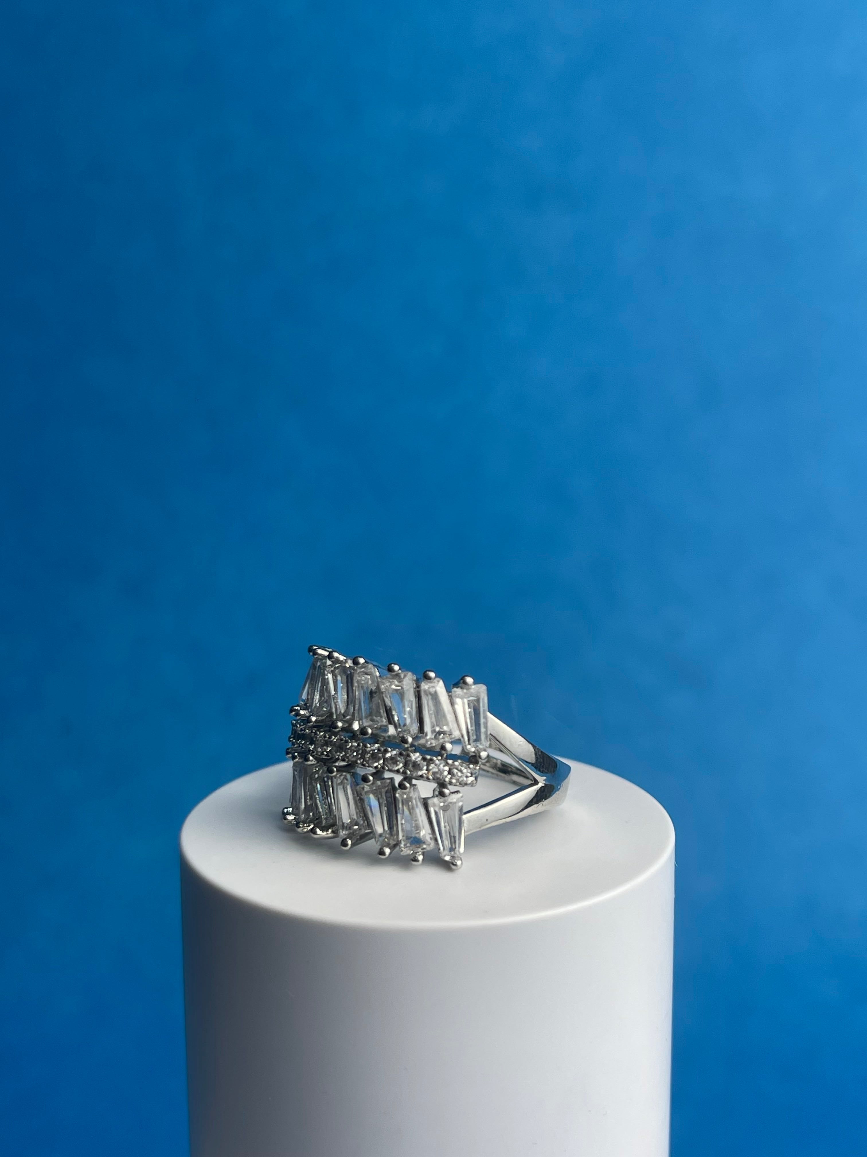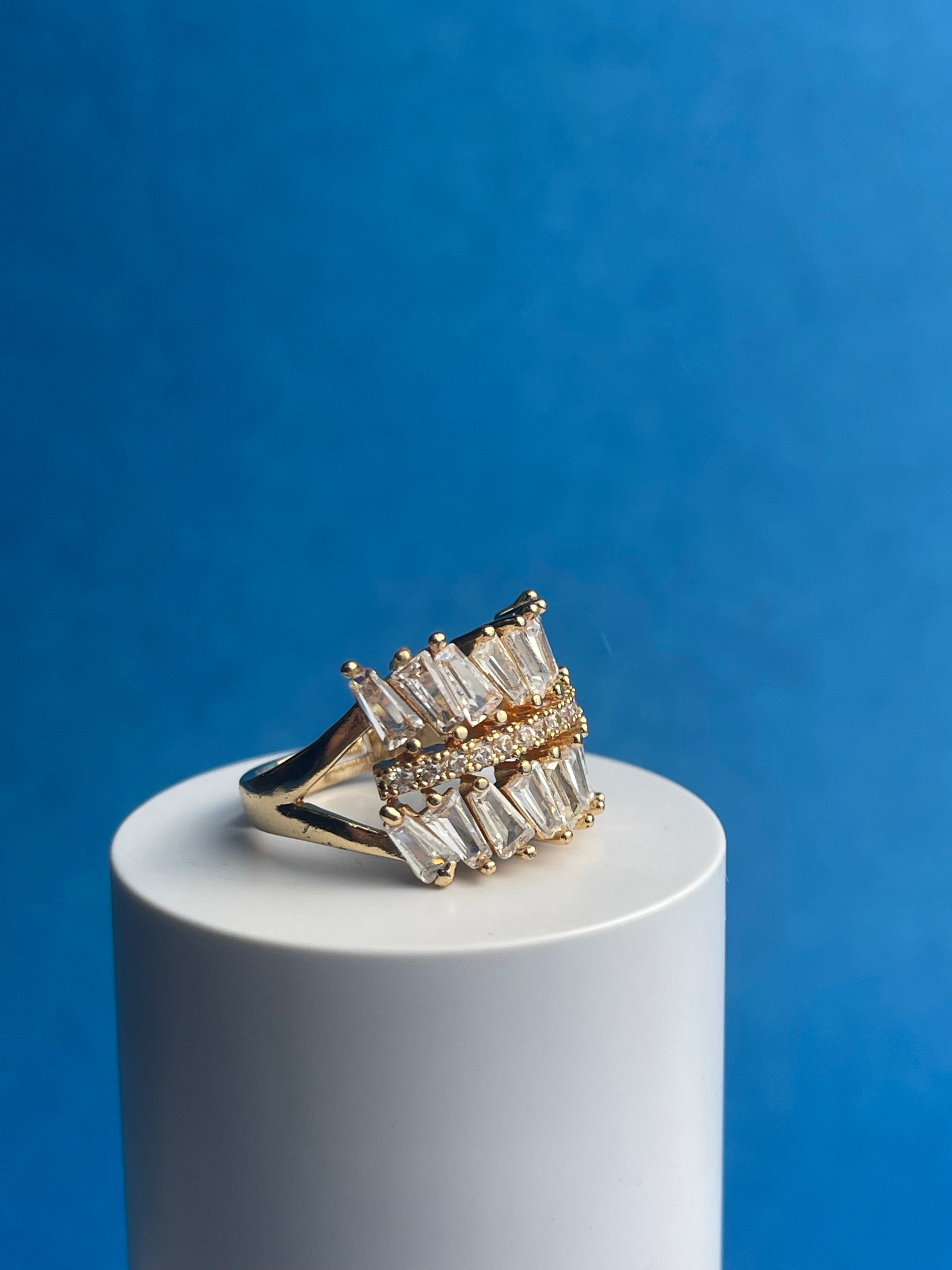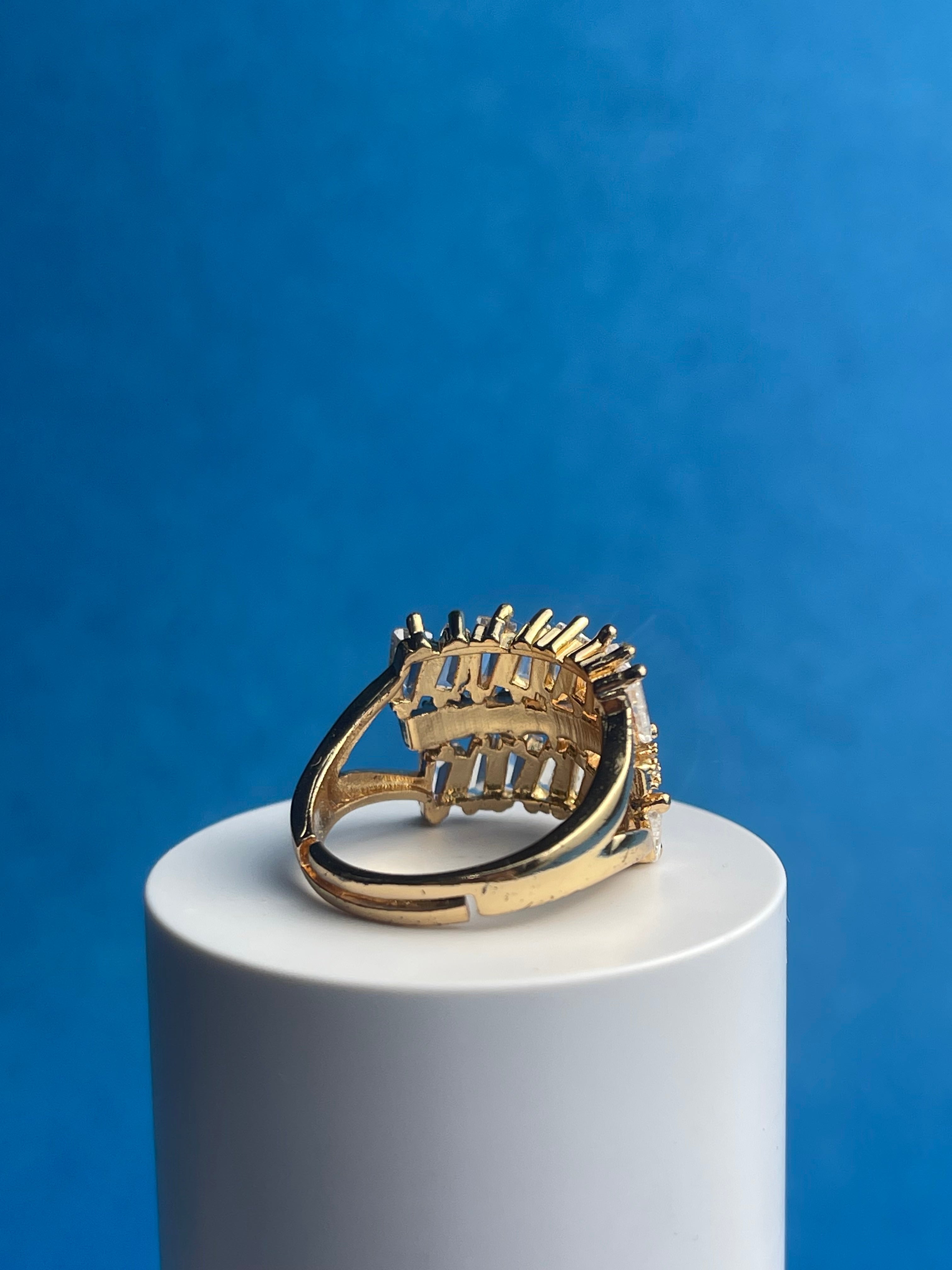 “The Wing” is a statement ring featuring a bold, asymmetrical design reminiscent of a bird’s wing in flight. A cascade of baguette-cut cubic zirconia stones creates a dazzling effect, while the gold-plated finish adds a touch of luxury. This piece is perfect for adding a touch of drama and sparkle to any outfit.