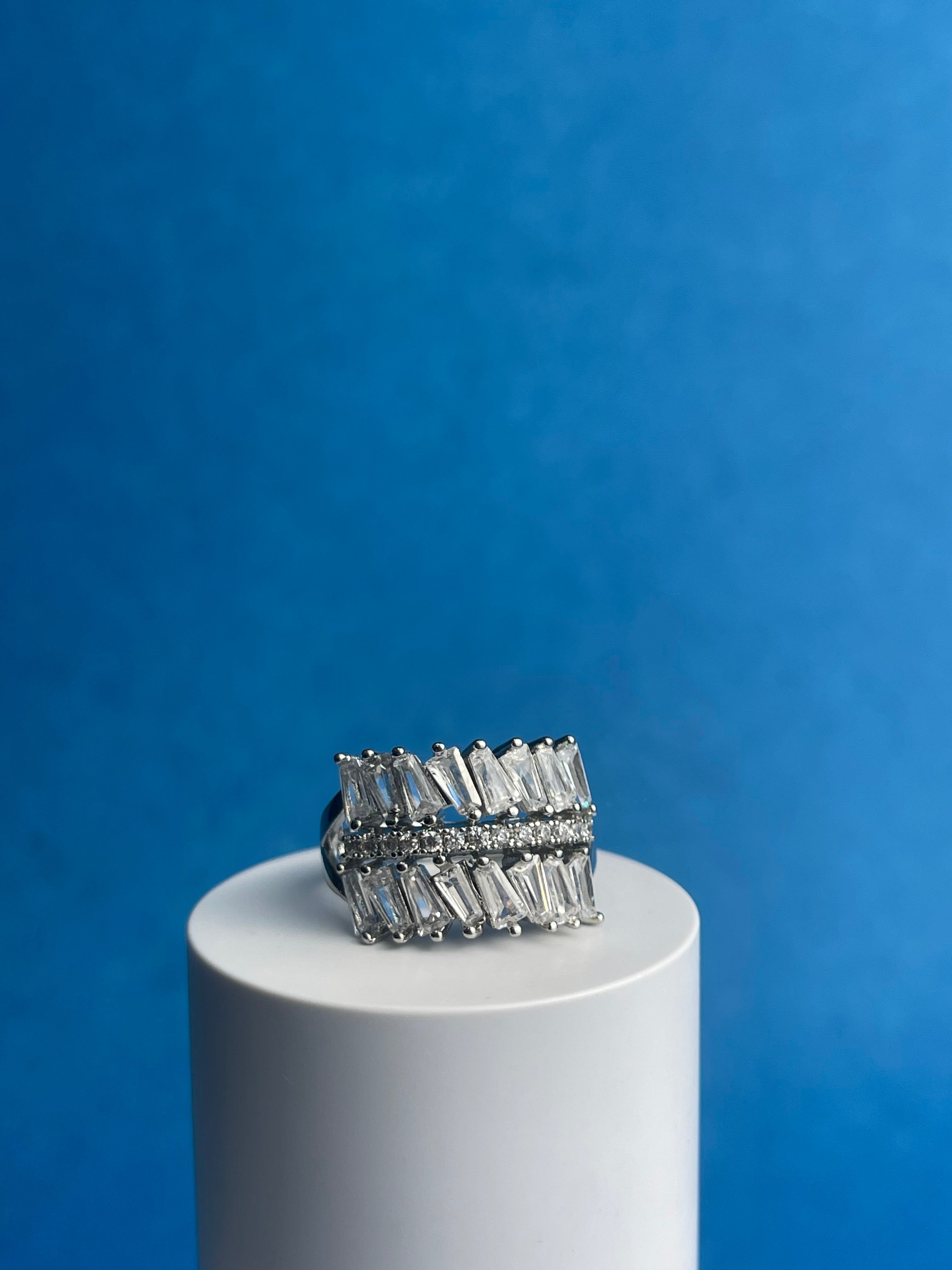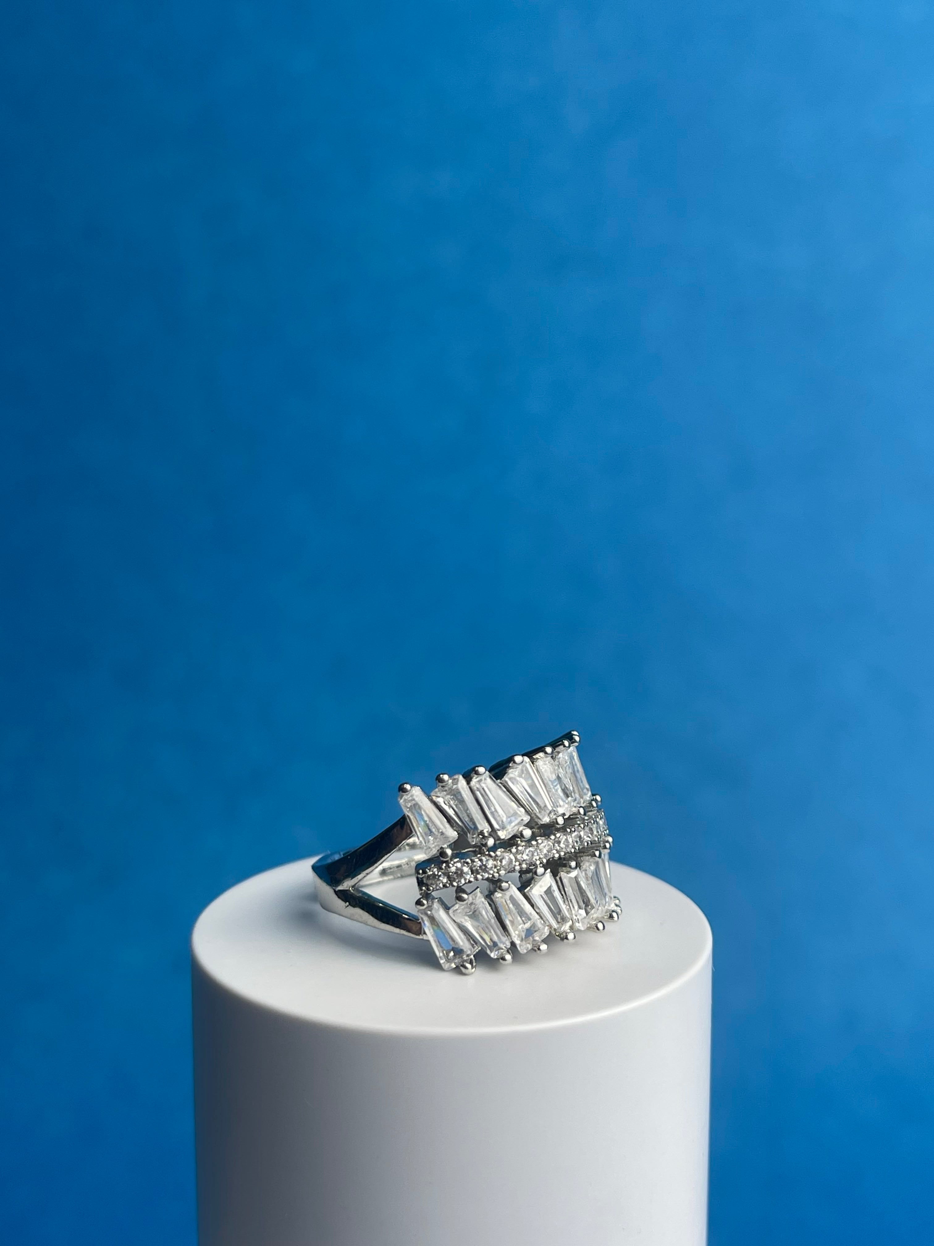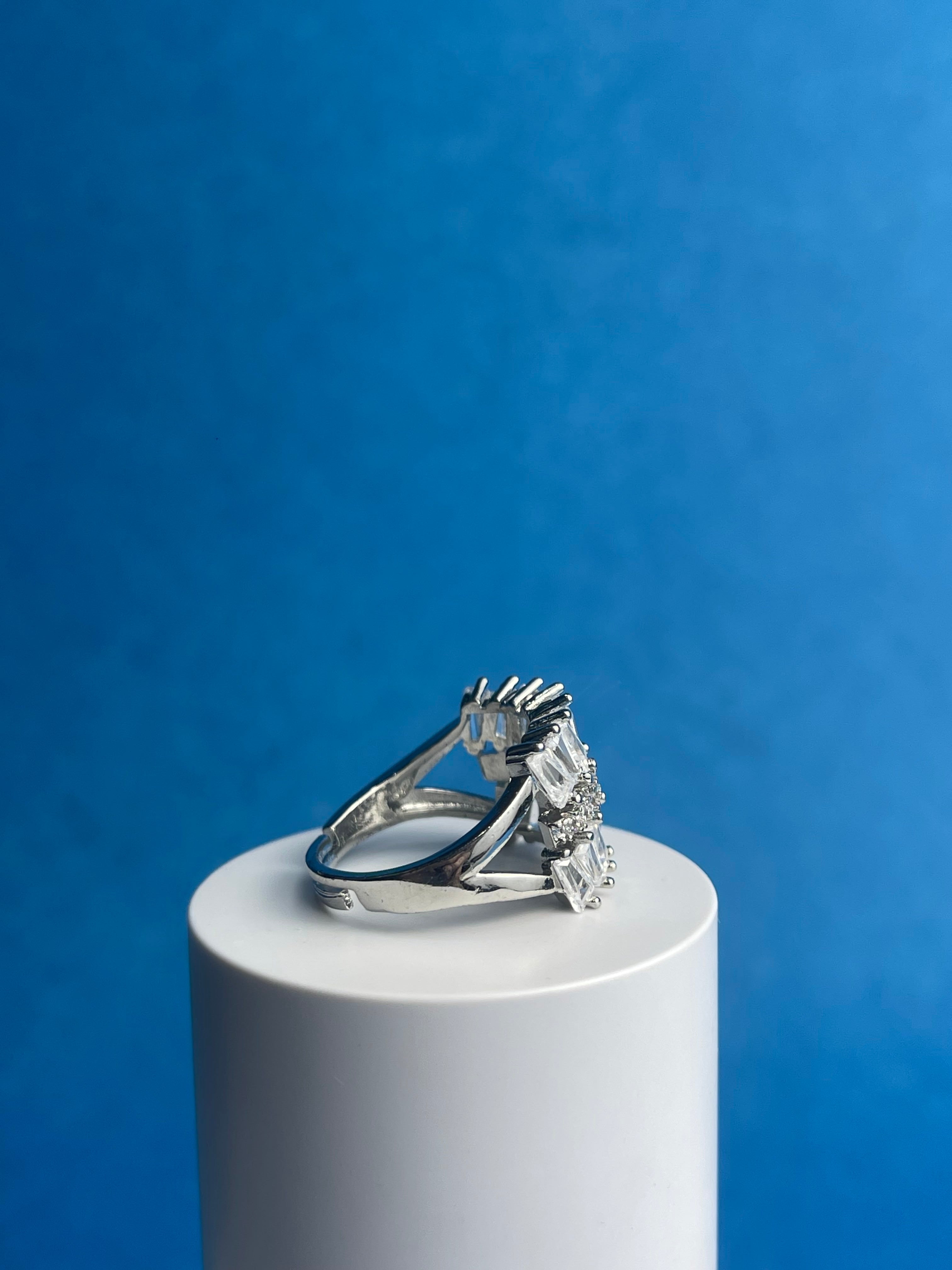 “The Wing” is a statement ring featuring a bold, asymmetrical design reminiscent of a bird’s wing in flight. A cascade of baguette-cut cubic zirconia stones creates a dazzling effect, while the gold-plated finish adds a touch of luxury. This piece is perfect for adding a touch of drama and sparkle to any outfit.
